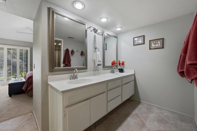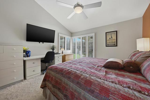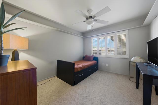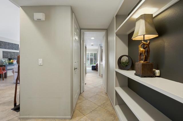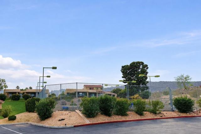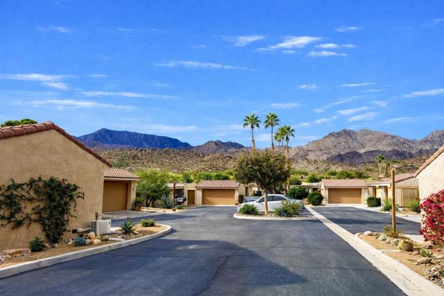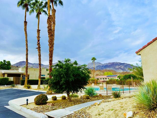 Ideally positioned as an end-unit residence, this beautifully maintained 2-bedroom, 1.75-bath condo offers an inviting blend of privacy, comfort, and thoughtful upgrades. Surrounded by mature landscaping, the home enjoys a rare grassy area directly adjacent to the patio, creating the feeling of a private yarda'perfect for relaxing, entertaining, or simply enjoying the desert sunshine.The kitchen has been remodeled with clean, contemporary finishes with Pental quartz counters, both functional and stylish. Just off the kitchen is a built-in office areaa'ideal for working from home, managing daily tasks, or creating a dedicated hobby or planning space without sacrificing living or dining areas.The undated interior is enhanced by high ceilings that add volume and an open, airy feel throughout the main living spaces. The living room flows seamlessly to the covered patio, extending the living area outdoors and providing a peaceful connection to the greenbelt just beyond.The primary bedroom is a comfortable retreat and features a remodeled en-suite bathroom with a walk-in shower, updated finishes, and a calm, spa-like feel. The guest bedroom is well-sized and conveniently located near the additional bathroom, making the layout practical for guests or everyday living.An air-conditioned, attached two-car garage is a significant feature, offering year-round comfort, generous storage, and direct access into the homea'often an uncommon convenience in condominium living.The community amenities are equally appealing. A pool is located just up the gentle hillside, while a pickleball/tennis court and a walking trail sit at the end of the quiet cul-de-sac, providing easy access to recreation without traffic or noise.Beautifully cared for and move-in ready, this end-unit condo offers a desirable combination of privacy, indoor-outdoor living, and a well-designed floor plan in a serene setting. An excellent opportunity for those seeking a low-maintenance lifestyle without giving up space, comfort, or connection to nature.