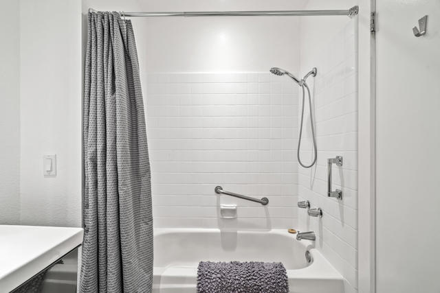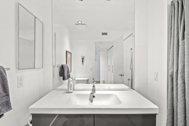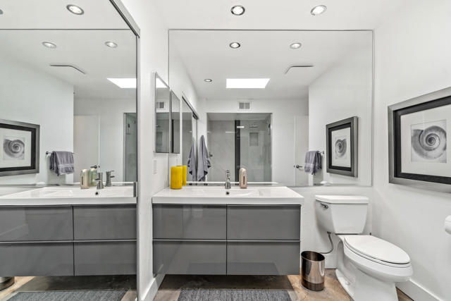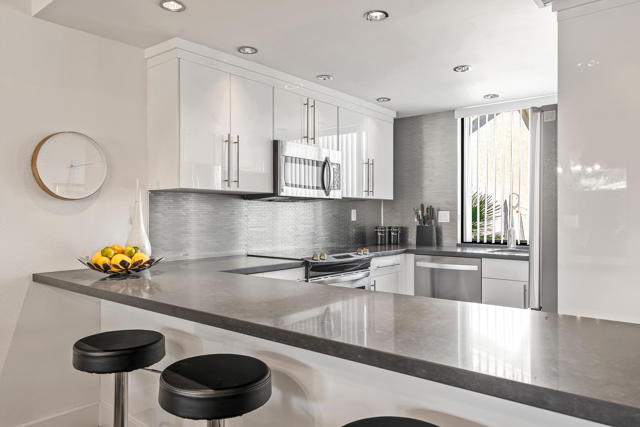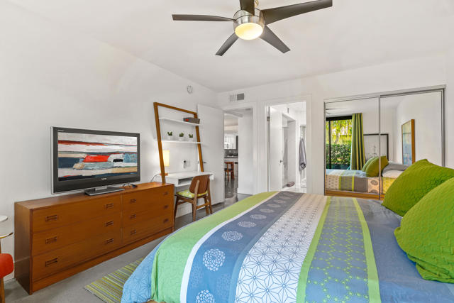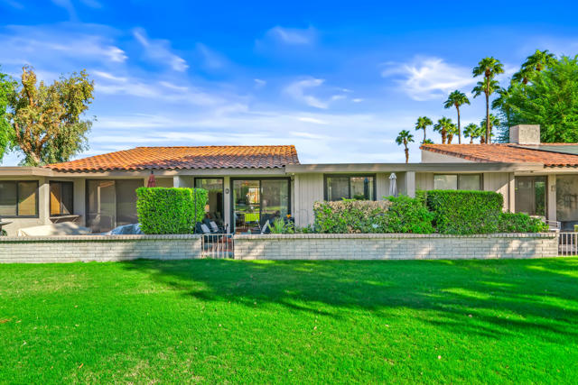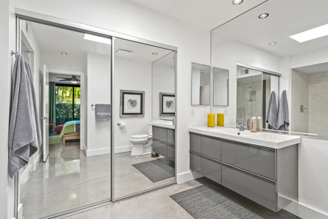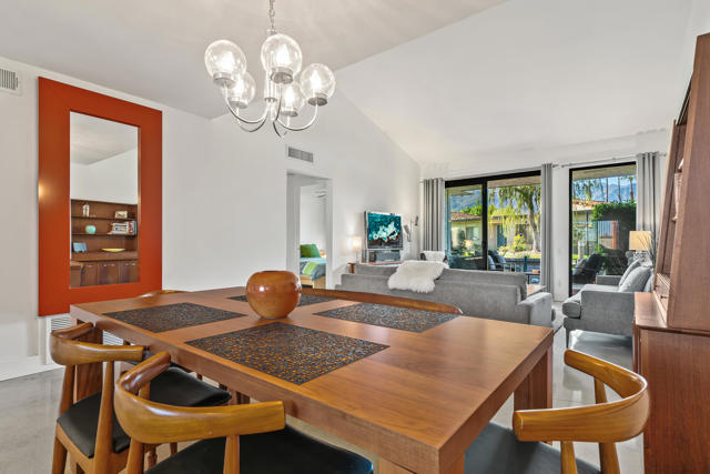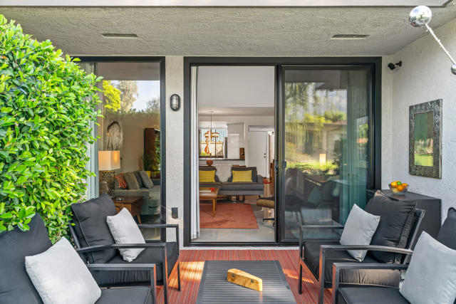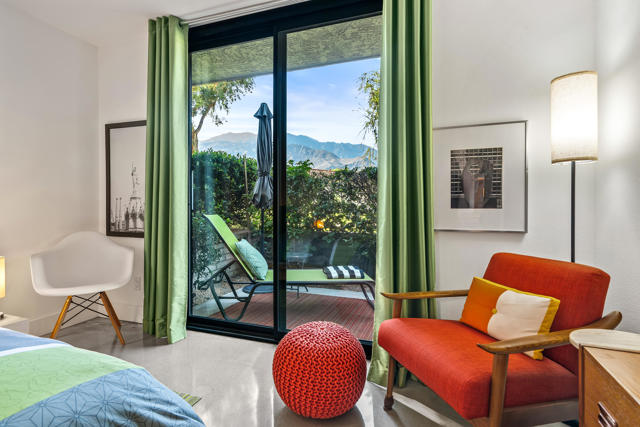 Discover a beautiful and stylish residence in the desirable fee simple (you own the land) gated community of Sunrise Racquet Club in central Palm Springs. This condo is minutes from downtown with its restaurants, entertainment, shopping and easy access to all of the city's attractions. Enjoy the prime location within the SRC community, with spectacular mountain vistas (East and West exposure). Extensively and thoughtfully remodeled, this 2-bed/2-bath condo offers 1,252 square feet of living space. The condo boasts multiple updates and upgrades, including polished concrete floors in all living areas, vaulted ceilings in main living space, new floor- to-ceiling double-pane and energy-efficient sliding doors in living room and primary suite. A new window in the kitchen, and a full-length glass storm door at the front entrance, optimizing sunshine from the East. Cook a delicious meal in the chef's kitchen with European style cabinetry, quartz slab countertops, modern backsplash, and stainless-steel appliances. Relax in the primary suite with ample closet space, a fully updated ensuite spa-like spacious walk-in tiled shower. Enjoy added peace of mind with a brand new 200-amp electrical panel and some new designer light fixtures. Additional highlights include a versatile guest bedroom with an office nook, two private and serene large patios with mature landscaping perfect for entertaining, inside private laundry, not to mention the convenience of an attached one-car garage. If you are looking for the easiest move-in, this elegant and comfortable home may be purchased fully furnished with a tasteful selection of mid-century modern furnishings (available outside of escrow). Sunrise Racquet Club offers resort-style living with 6 pools/spas, tennis, pickleball and racquetball courts, and a clubhouse set among 43-acres of manicured grounds with ponds, lakes and walking trails. This property has been a very successful vacation rental property (14-day minimum rentals period allowed). And it will make for a wonderful primary or secondary residence. Desert living at its best!