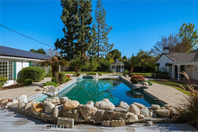 Welcome to this classic Sherwood Forest estate where privacy and space come together seamlessly. Tucked away from the street on an expansive 0.80-acre lot, this inviting 3 bedroom, 3 bath residence offers nearly 2,700 sq. ft. of thoughtfully designed living space. The single-story floor plan flows effortlessly between distinct living and dining areas, anchored by a cozy fireplace and bathed in natural light from oversized picture windows. Step outside to discover your private retreat—park-like grounds that provide complete serenity and endless possibilities. The generous backyard serves as your personal canvas, featuring a sparkling pool and a detached pool house complete with one bedroom, one bathroom, and a kitchenette. Additional highlights include convenient RV parking with dedicated gated access. Nestled in one of Northridge's most coveted enclaves, renowned for its rural character and rare estate-sized parcels, this property presents a unique opportunity to enjoy comfortable living today while building substantial equity for tomorrow.