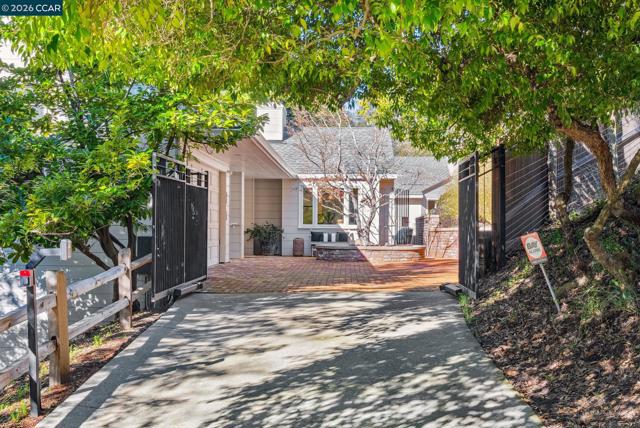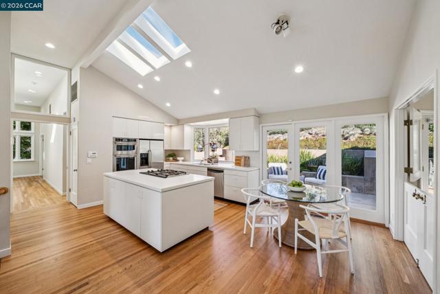 Privately set in Country Club neighborhood, classic Orinda home enjoys views of hills & timeless style & charm throughout - just steps from Lake Cascade. Wide-plank hrdwd floors, vaulted & wood beamed ceilings, abundant picture windows & 5 sets of French doors create warm, light-filled ambiance - perfect entertaining spaces. Designed for one-level living, main floor offers gracious entry, formal & dining rooms w/garden views. Heart of the home: kitchen/great room: light/bright w/large island, crisp white cabinetry, stainless steel appl., lovely sitting room & eat-in area w/access to brick patio & viewing deck. Spacious primary retreat: w/vaulted ceilings, beautiful outlooks, separate sitting area w/fireplace & access to gardens. Spa-like bath offers dual sinks, soaking tub, curbless shower, walk-in closet. Two add'l bdrms w/ exterior access share lovely updated bath. Lower level w/access from 2nd driveway includes bdrm, private bath, laundry & bonus space: au-pair, in-law, office, gym, art studio & private outdoor patio Professionally designed gardens w/lovely brick driveway offers warm welcome, plenty of space for gardening, entertaining & play! Equipped w/solar panels+ battery, EV charger & exceptional storage - located near town, commute routes, BART, top rated Orinda Schools