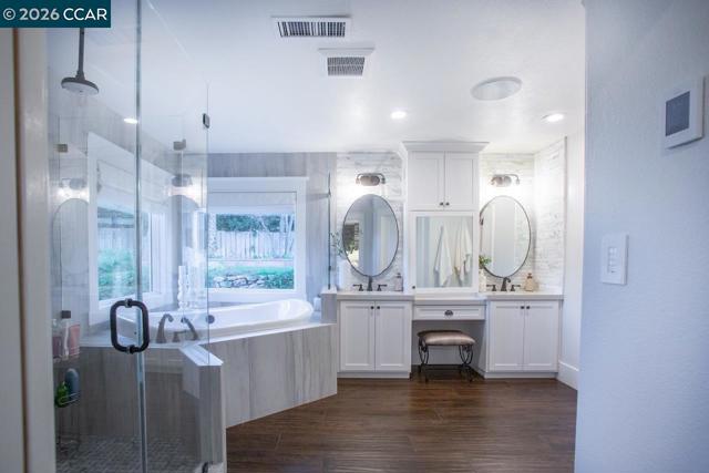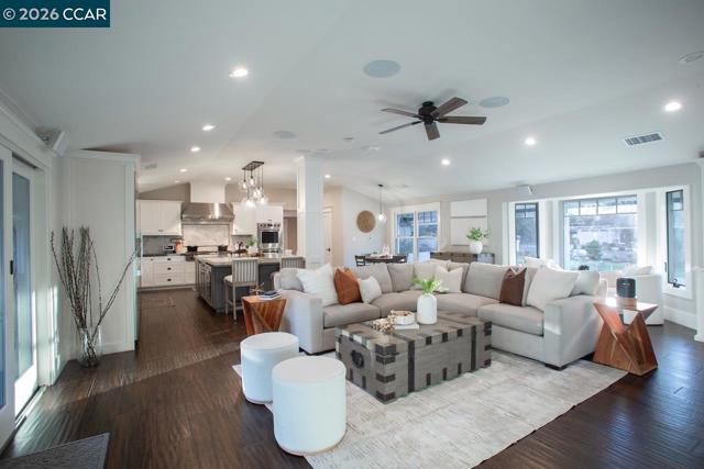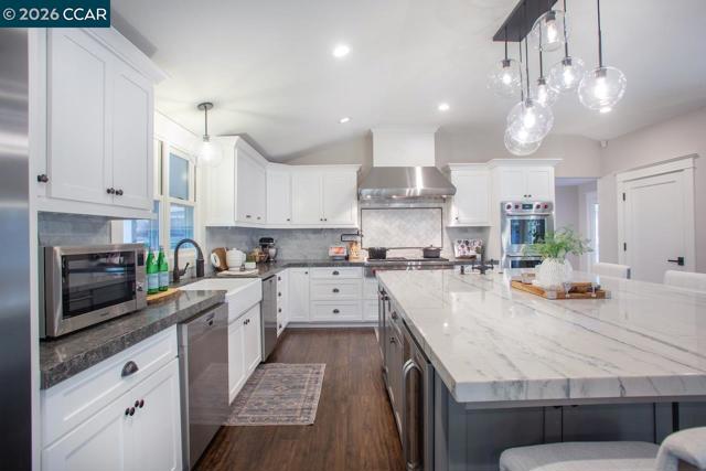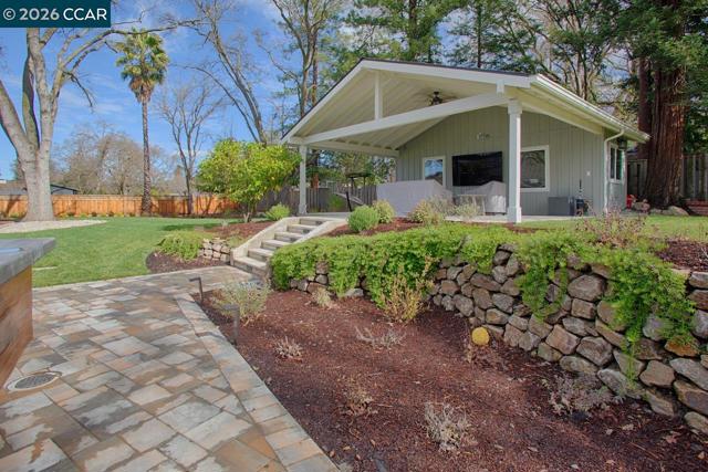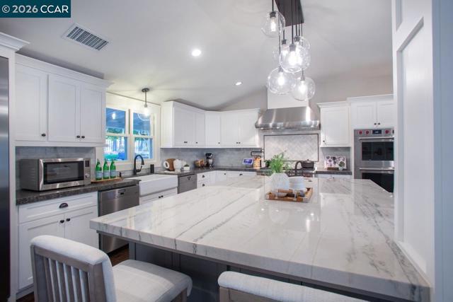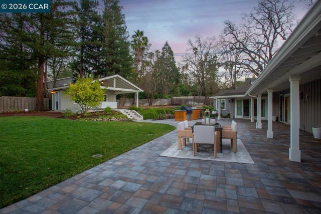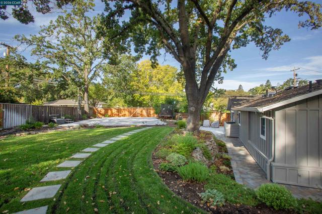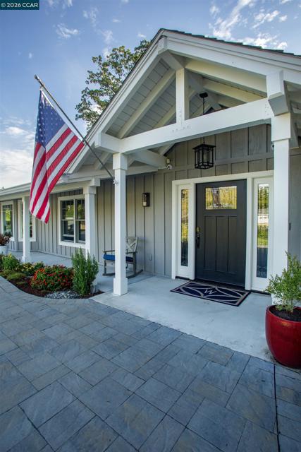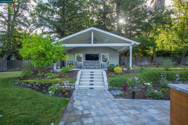This stunningly renovated single-story ranch-style home in coveted South Walnut Creek, offers two en-suites, great room, and formal dining. The open-concept layout creates seamless indoor/outdoor flow. The gourmet kitchen features Wolf SS appliances, built-in refrigerator, 2 convection ovens, 9' island, quartz counters, farmhouse sink, wine fridge, 6-burner gas range with indoor grill, pantry, and 2 dishwashers. Fabulous primary suite, oversized bedrooms, large closets, vaulted ceilings, tile floors, and laundry/mudroom. Updated baths, guest powder room, French doors/sliders, and smart-home features throughout. Outdoor highlights include a loggia with finished outdoor structure for gym or office with built-in California closets cabinetry, newer paver driveway, private park-like grounds, sport court, lush lawns, mature landscaping, and well on site.