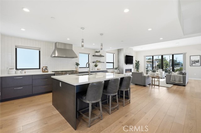 Form follows function in this stunning architectural residence impressively positioned atop the desirable Hermosa Hills and displays a commanding presence. The exquisite exterior captivates and beckons you into a light-filled foyer where a custom metal staircase railing adorns and tiles, hues, and textures sets the tone for the refined interior. Step up to an exceptional open concept floor plan that offers extraordinary entertainment possibilities, and effortless everyday living. The extensive great room is both phenomenal and sophisticated—wide plank wood floors tastefully adjoin a focal point fireplace that creates a warm and peaceful ambiance. The sparkling wall of glass doors allows sunlight to filter throughout the home and opens to vast west-facing ocean views, offering a refreshing backdrop of fresh air and spectacular sunsets. Seamless indoor-outdoor living defines this level, extending the experience to a rooftop deck with breathtaking panoramic views—the surroundings are plentiful and endlessly inviting. The heart of the home is a beautiful kitchen that delights any culinary enthusiast. Appointed with premium Thermador appliances, an abundance of cabinetry, walk-in pantry and an over-sized center island that serves multiple purposes such as a morning breakfast bar, prep area, or the ultimate entertaining hub. The addition of a roomy dining area offers relaxed get-togethers making every day feel special. Conveniently designed for comfort and privacy three substantial bedrooms on one level provide easy family living. The lavish primary suite is a true sanctuary, offering a spa inspired ensuite with dual vanities, soaking tub, glass enclosed walk-in shower, expansive walk-in closet, and all-embracing balcony expands the space allowing fresh ocean breezes. Two more airy bedrooms share a stylish bath creating a calm and tranquil setting for rest and rejuvenation. The lower level offers a private guest bedroom that can easily make for an outstanding home office with direct access to an outdoor patio. Additionally, a laundry room, direct garage access, and a 3-stop elevator makes a foundation for daily living. Hermosa means beautiful, and Hermosa Beach truly lives up to its name. This spectacular coastal community blends white sandy beaches, ocean air, and small-town charm, offering an unparalleled Southern California lifestyle. Award winning schools, trendy eateries, are all only a stroll away… Love Where You Live.