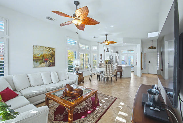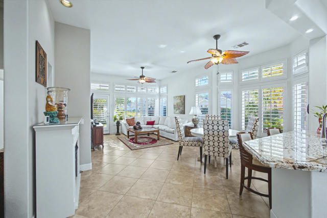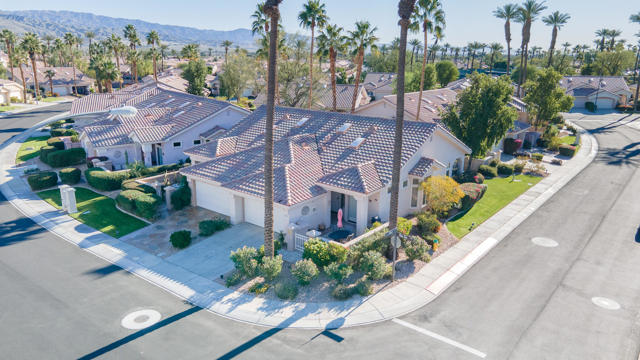 Rare opportunity in Sun City Palm Desert: one of only six charming villas. This northwest-facing corner lot is beautifully maintained. Featuring a 1,050 sq. ft. home (only the second owner) with an open floor plan, 1 bedroom, 1 bathroom, wooden shutters throughout, a newer A/C unit, and washer/dryer inside the home. Enjoy the private back patio with mature dwarf citrus trees, a one-car garage with built-ins plus a dedicated golf cart parking spot, and the convenience of being sold furnished and move-in ready--this delightful villa won't last. Schedule your showing today!