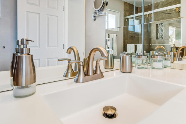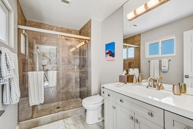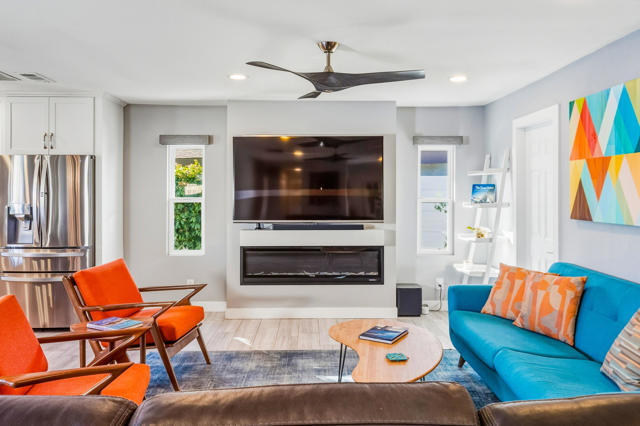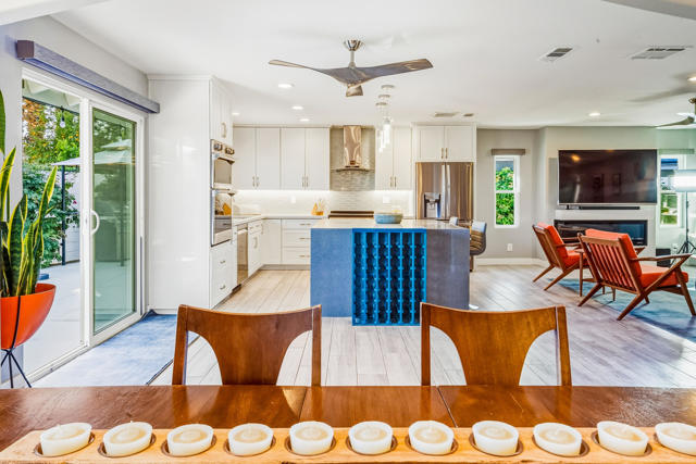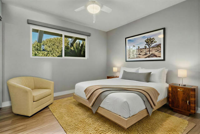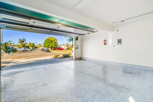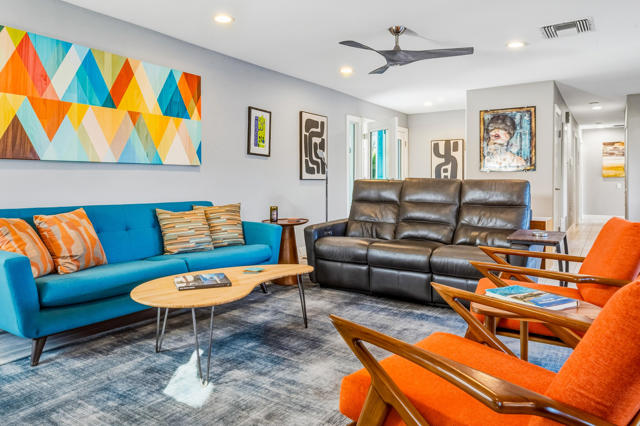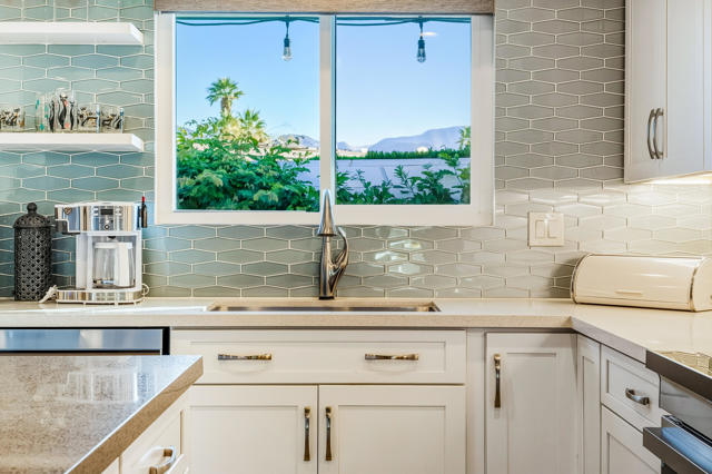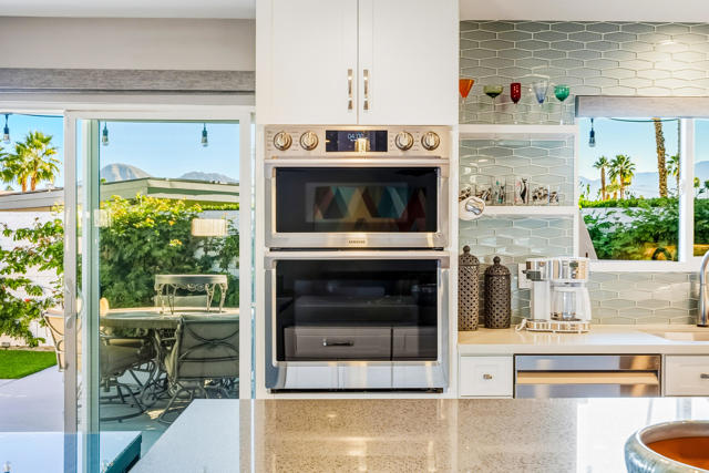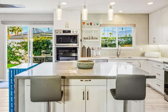 Experience refined living in this beautifully updated central Palm Desert residence, where mid- century design meets thoughtful functionality. The layout has been skillfully transformed into three bedrooms with (generous storage and closet space) plus a formal dining room that flows into kitchen and great room. You're greeted by a bright, open Great Room highlighted by oversized porcelain tile flooring and a sleek, modern kitchen featuring quartz countertops, a quartz waterfall island, soft-close cabinetry, and premium stainless steel appliances. The chef's kitchen is equipped with three ovens (including two convection), an induction range with vented hood, and a high-efficiency dishwasher, making it ideal for both everyday cooking and entertaining. Looking out the kitchen, dining and bedroom windows you are treated to stunning southern Mountain Views. Both fully renovated bathrooms offer a spa-like feel with high-end fixtures, designer finishes, and meticulous attention to detail. Most major systems including air conditioning, electrical and evaporative cooler are all less than 5 years new. Designed for modern convenience, the home functions as a fully integrated smart home, allowing remote control of lighting, window coverings, temperature, and electronic systems from your phone or computer. Energy efficiency is enhanced with an owned solar system complete with two batteries, delivering long-term savings and backup power.Additional standout features include a climate-controlled mitsubishi mini split in garage with motion detection lighting perfect for detailing your car or doing shop work, plus epoxy-coated flooring and a low-maintenance outdoor space with artificial turf, offering year-round enjoyment with minimal upkeep.This exceptional Palm Desert home blends style, comfort, and efficiency in a highly desirable location.