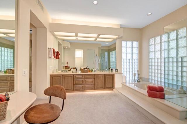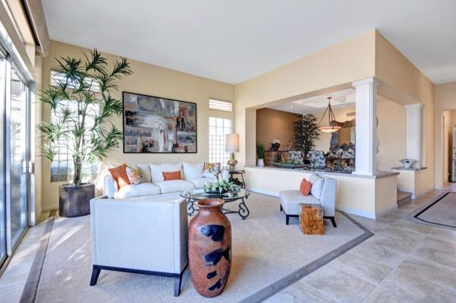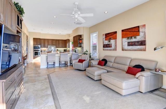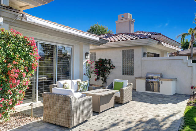 This expansive 3,102-square-foot residence offers an exceptional opportunity to create the desert retreat you've been dreaming of, showcasing breathtaking, unobstructed lakefront, golf course, and snow-capped San Jacinto Mountain views. Designed for both gracious entertaining and relaxed everyday living, the open, light-filled floor plan is perfectly framed by dramatic water and mountain vistas at every turn. Thoughtful upgrades enhance both comfort and style, including a **welcoming living-room fireplace--ideal for cozy evenings with a book or your favorite show--**large-format porcelain tile flooring, custom area rugs, stacked plantation shutters, and electronic interior sun shades. The spacious, well-designed kitchen invites the chef in the family, complete with stainless steel appliances and generous workspace. Additional features include Toto toilets, newer water heaters, and modern finishes throughout. Outdoor living is elevated to another level with an extraordinary wraparound patio spanning over 1,660 square feet of pavers, offering a true extension of the home. Entertain with ease around the built-in BBQ and fire pit, relax on beautifully appointed patio furnishings while watching the golfers sink their putt on the 6th hole of the Grove Course, and enjoy a front-row sunset view reflecting across the lake and mountain backdrop. Ideally positioned on a quiet cul-de-sac, the home sits just two doors from one of the community's 37 pools and spas and is a short walk to Rover's Ridge dog park. You can enjoy watching the golfers sink their putt on the HOA dues provide exceptional value, including Wi-Fi, expanded cable, landscaping, exterior water and electricity, exterior painting, tree trimming, pest control, roof maintenance, trash service, and structural fire insurance. Offered furnished per inventory, this is a rare opportunity to personalize a large-scale, view-driven desert home in a truly special setting. Schedule your private showing and begin imagining this as your own dream retreat.