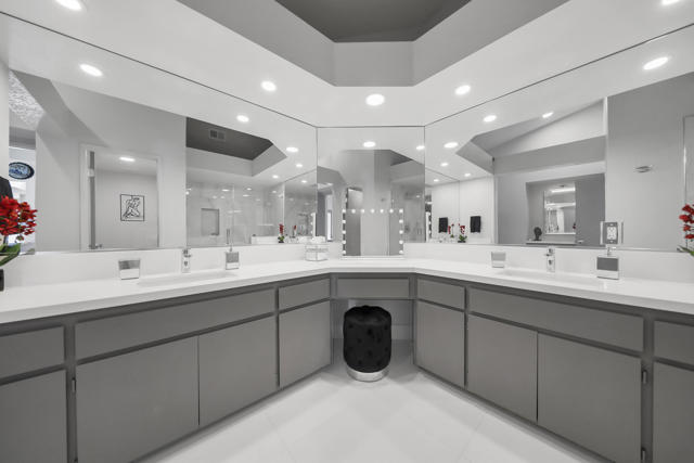 COMPLETE REMODEL & REIMAGINED OPEN-CONCEPT FLOOR PLAN! This striking ''Upper Level Villa'' showcases soaring vaulted ceilings, crisp modern design, and direct mountain views. The entire interior has been beautifully transformed in a six-figure renovation, offering a turn-key lifestyle where every detail has been thoughtfully curated -- just bring your luggage and enjoy. Gleaming white tile floors flow seamlessly throughout, creating a bright, airy atmosphere enhanced by recessed LED lighting and designer ceiling fans. The expanded kitchen features sleek Quartz countertops with counter-height bar seating for four, upgraded cabinetry with soft-close drawers, and black stainless appliances -- including a single-basin sink and wine fridge at the custom wet bar. A French door opens to a private front patio facing east, perfect for enjoying your morning coffee in the sun or a quiet outdoor meal. The adjacent dining area offers flexible use -- ideal for formal dining, casual entertaining, or even a game space for billiards or ping pong. The living room's fireplace adds warmth and charm, with sliding glass doors leading to a private rear patio where you can relax and take in beautiful mountain vistas. The spacious primary suite has been updated to include a luxurious spa-inspired bathroom with a large tiled shower and bench, Quartz vanity, and premium fixtures. A second updated bath serves guests with equal style. Additional features include a separate in-unit laundry room, private double-car garage, and a new 2024 water heater. This villa is conveniently situated near one of the community's large pool and spa areas -- perfect for enjoying the resort atmosphere right at home. Desert Falls Country Club offers residents access to the highly rated Scottish Links Championship Golf Course -- a Golf Digest 4-Star ''Best Places to Play'' course -- with both ''pay as you play'' and membership options available. The gated community includes 30+ pools and spas, tennis, pickleball, fitness center, clubhouse with dining and social events, cable, Wi-Fi, building maintenance, and 24-hour security -- all included in your HOA dues. Centrally located in Palm Desert near fine dining, shopping, and entertainment, just minutes from Acrisure Arena, Agua Caliente Spa & Casino, Indian Wells Tennis Garden, McCallum Theatre, and the El Paseo Shopping District -- the desert's premier luxury shopping and dining destination. Short-term rentals permitted!