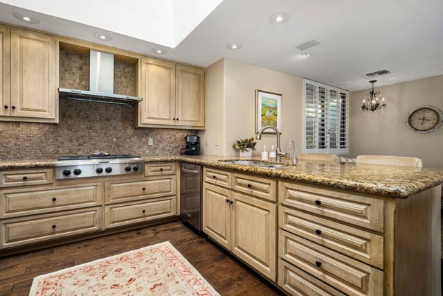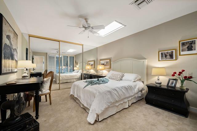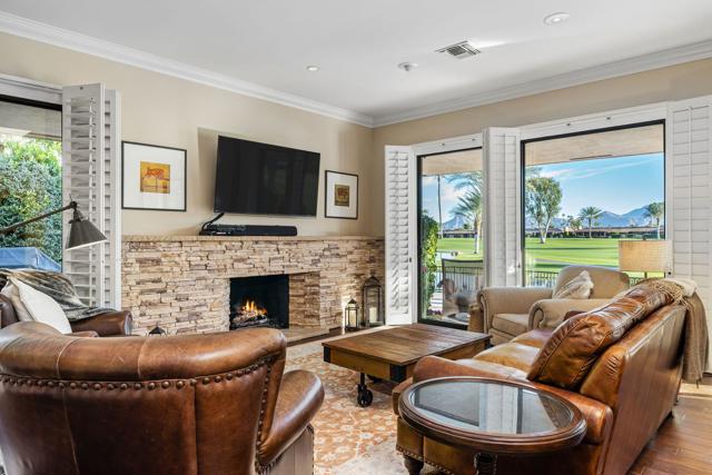 Experience the stunning sunsets of this French Country charmer, offering expansive, south-facing views of a lake, lush golf course fairways, and the surrounding San Jacinto and unobstructed views of Eisenhower mountains. Located within The Springs Country Club community, this property provides a picturesque and private setting that perfectly captures the desert landscape. The patio serves as an ideal vantage point, situated just steps away from the water.The home features 2,849 square feet of living space in the popular Shaughnessy floor plan, including 3 bedrooms and 3 bathrooms. Unlike the sterile aesthetic of many modern homes, the French Country-inspired decor creates a warm and inviting atmosphere. The living area overlooks the water and mountains, highlighted by a stacked stone fireplace, floor-to-ceiling windows, a formal dining area, and a built-in bar with a wine cooler. The layout also includes an eat-in kitchen area, which can double as a comfortable family room.The primary suite offers a sunken tub, dual vanities, and a spacious layout. Adjacent to the suite is a dedicated office or sitting room with a built-in bookshelf great to pair with a desk, also overlooking the water. Both guest bedrooms have bathroom access, with one serving as a private en-suite.Outside, the property is beautifully landscaped, featuring a stunning glass-door entry, which allows a glimpse of what's to come. The community is renowned for the private, recently renovated Desmond Muirhead 18-hole golf course. Recent $16 million improvements include an upgraded irrigation system and enhanced practice facilities, such as a driving range, short game area, and putting green. This premier location is minutes from the Palm Springs airport and close to premier shopping and dining at The River and El Paseo.