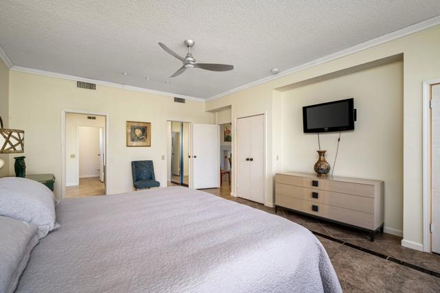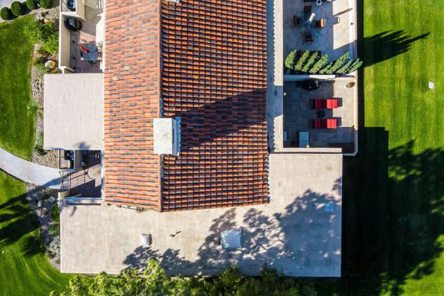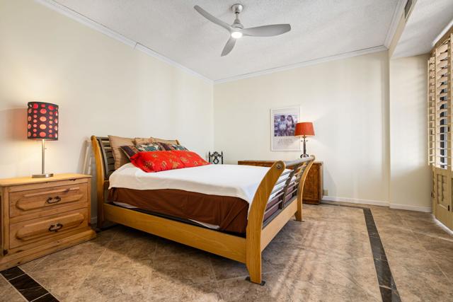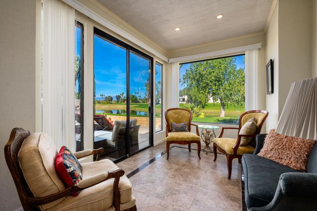 Welcome to 128 Desert West Drive, located inside the gates of Mission Hills Country Club in Rancho Mirage--a serene desert retreat offering privacy, style, and picturesque lake views. A private courtyard entry creates an elegant first impression, with both front-door access and a sliding glass door leading to the guest bedroom--ideal for hosting guests or flexible living. Inside, tall ceilings enhance the home's light and airy feel. The updated kitchen features quartz countertops, stainless steel appliances, warm-toned cabinetry, and a spacious center island, offering generous storage and a functional layout for everyday living and entertaining. A sunlit den adjacent to the kitchen provides versatility and can serve as a dining area, office, or additional living space. The great room is highlighted by a dramatic slanted ceiling with exposed wood beams and a cozy fireplace, creating a refined yet inviting atmosphere. Tile flooring flows throughout the home for a clean, cohesive look. A bonus room with large windows offers endless possibilities as a library, sitting room, or creative retreat. The primary bathroom includes a shower-over-tub, while the guest bathroom offers a walk-in shower. An indoor laundry closet is conveniently located in the hallway. The guest bedroom enjoys direct access to the front courtyard through a glass slider. The rear patio provides a peaceful setting to enjoy lake views, perfect for relaxing or entertaining. The property also includes a detached two-car garage plus a golf cart garage, currently used for additional storage.