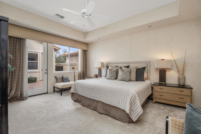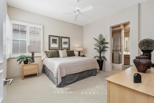 Discover a residence where sophisticated ''desert contemporary'' design meets the tranquil allure of a private retreat. Originally constructed as one of the builder showcase homes at Rancho La Quinta Country Club, this Encanto I floor plan offers a refined transitional style, and is being sold turnkey furnished for an effortless transition to the desert lifestyle. Accommodating three spacious bedrooms, this intuitive design emphasizes connection without sacrificing privacy. Each room is appointed with its own dedicated en-suite bath, creating a true retreat-style environment for residents and guests alike. The expansive primary suite shares a secluded private courtyard with the versatile bonus room (currently used as a 4th bedroom) - the ideal setting for morning yoga or a quiet cup of coffee. Framing the serene rear yard, the great room uses 10' sliders to showcase breathtaking views of the golf course and Santa Rosa Mountains. The outdoor space is designed for the ultimate desert resort lifestyle. From the pool and spa to the custom firepit, every element captures the glow of both stunning sunrises and sunsets. Complete with a two -car plus golf cart garage and world-class club amenities, this home represents a rare opportunity for a discerning buyer seeking exclusivity and elegance.