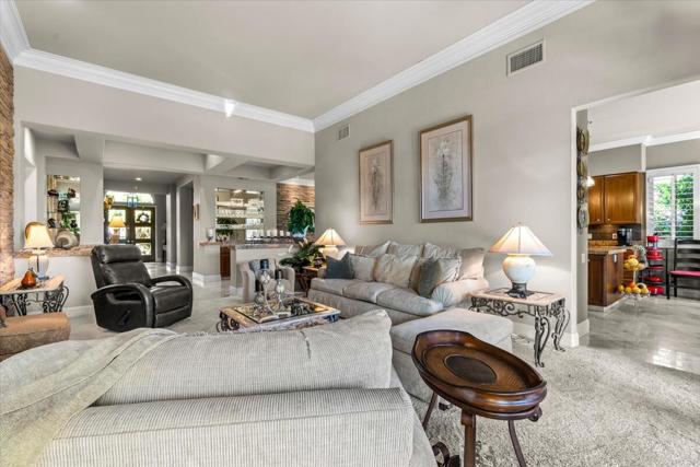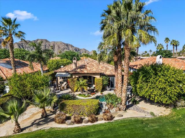 Designed for seamless indoor-outdoor living. Expansive glass doors open to a south-facing private retreat. Here, a resort-style pool and spa with a dramatic waterfall feature anchor the outdoor experience, complemented by a generous covered patio and outdoor fireplace--ideal for entertaining beneath desert skies or enjoying tranquil evenings by the fire.Lush tropical gardens, accented by mature kumquat and grapefruit trees, surround the property, offering privacy and a sense of serene escape. A paver-stone driveway enhances curb appeal, while the home's orientation captures natural light throughout the day. Whether enjoyed as a full-time residence or an elegant seasonal retreat, this exceptional property embodies the art of elevated desert living.A sophisticated Hacienda Two designed for elegant desert living, this 3,265-square-foot, four-bedroom residence seamlessly blends architectural presence with resort-style comfort. The expansive great room is anchored by dramatic stone veneer walls, creating a warm yet refined ambiance ideal for both intimate gatherings and grand entertaining.Walls of glass open to a sun-drenched, south-facing outdoor retreat featuring a resort-inspired pool and spa with a striking cascading waterfall. A spacious covered patio with outdoor fireplace invites year-round enjoyment, while lush tropical landscaping--accented by mature kumquat and grapefruit trees--provides a serene, private oasis.Thoughtfully curated details include a paver-stone driveway, seamless indoor-outdoor flow, and timeless finishes throughout. Whether hosting under the desert sky or enjoying quiet mornings surrounded by greenery, this exceptional home captures the essence of luxury desert living at its finest.