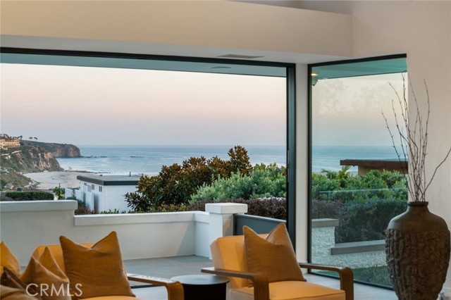 MORE PHOTOS COMING THIS WEEKEND || Prominently positioned in guard-gated Monarch Bay, this single-level coastal residence captures striking ocean, whitewater, sand, Headlands, and Ritz-Carlton views from its main living space. Nearly completely redesigned within the last five years, the home spans approximately 3,500 square feet and blends clean architectural lines with a warm, soft-contemporary aesthetic designed for elevated yet comfortable living. A beautiful entry atrium leads into an open great room filled with natural light and thoughtfully connected to the outdoors at multiple points. Smooth-coat walls, clean detailing, and carefully selected materials reinforce the home’s refined, contemporary feel throughout. The kitchen is outfitted with Miele appliances and integrates seamlessly with the living and dining areas, making it equally well suited for everyday living and larger-scale entertaining. The true centerpiece of the home is the dramatic living room, featuring soaring 12-foot ceilings, expansive Fleetwood windows and doors, oversized sliders oriented to the ocean views, an 8-foot glass fireplace, and a built-in wet bar. The open layout was intentionally designed to maximize light, flow, and indoor-outdoor living through versatile, interconnected spaces. The property has been thoughtfully upgraded with integrated wiring for cameras and speakers throughout, supporting modern living without compromising the home’s clean aesthetic. Outdoors, newly completed pool, spa, hardscape, softscape, water features, and a putting green create a private, resort-style setting. New roof installed in 2025. A beautifully landscaped entry courtyard, mature olive tree, and curated outdoor lighting further elevate the arrival experience. Monarch Bay residents enjoy exclusive access to the Monarch Bay Private Beach Club, operated by the Waldorf Astoria Monarch Beach, offering beach chair service, dining, bar, and events, along with newly added tennis, pickleball, and playground amenities. With a prime location among five-star resorts, year-round golf, and world-class beaches, exceptional coastal views from its primary living space, and refined single-level design, this is premier Monarch Bay living within one of Southern California’s most sought-after guard-gated communities, and only one hour from both Los Angeles and San Diego.