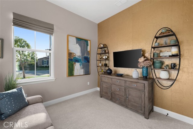 Modern Ranch meets California Coastal in this exquisitely upgraded Ventana floorplan, perfectly positioned to capture sweeping views of the vineyards, the shimmering lake and fountain, and the mountain range that frames the horizon. From sunrise to sunset, the scenery becomes a stunning natural backdrop—ever changing and always captivating. The home’s exceptional curb appeal sets an immediate impression of quality. Fresh exterior paint, stone-accented retaining walls, and a beautifully designed paver courtyard with a tranquil fountain create a welcoming entry that reflects the care and attention invested throughout the property. Inside, the chef’s kitchen features stylish white cabinetry with premium hardware, quartzite slab countertops, a generous island, a built-in refrigerator, and stainless appliances with a sleek range hood. The kitchen opens seamlessly to the great room, where a dramatic floor-to-ceiling stacked-stone fireplace adds warmth and architectural presence. Professionally designed interiors elevate every room. Automatic window treatments, plantation shutters, oak hardwood floors, and wallpaper-accented rooms create a sophisticated aesthetic. The optimized Smart-Space laundry room enhances convenience with custom cabinetry, a sink, and a built-in desk area along with a bay of cabinets in the garage for added storage. The outdoor living experience is a true highlight of this home. The covered patio functions as an additional living room, offering year-round comfort with a drop-down shade and generous space for dining or lounging. Beyond, paver pathways lead to a peaceful sitting area with built-in firepit overlooking the lake and fountain—an ideal vantage point to enjoy the reflection of the sun on the water and the dramatic silhouette of the mountains as the sky shifts throughout the day.