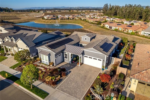 Modern Ranch meets California Coastal in this exquisitely upgraded Ventana floorplan, perfectly positioned to capture sweeping views of the vineyards, the shimmering lake and fountain, and the mountain range that frames the horizon. From sunrise to sunset, the scenery becomes a stunning natural backdrop—ever changing and always captivating. The home’s exceptional curb appeal sets an immediate impression of quality. Fresh exterior paint, stone-accented retaining walls, and a beautifully designed paver courtyard with a tranquil fountain create a welcoming entry that reflects the care and attention invested throughout the property. Inside, the chef’s kitchen features stylish white cabinetry with premium hardware, quartzite slab countertops, a generous island, a built-in refrigerator, and stainless appliances with a sleek range hood. The kitchen opens seamlessly to the great room, where a dramatic floor-to-ceiling stacked-stone fireplace adds warmth and architectural presence. Professionally designed interiors elevate every room. Automatic window treatments, plantation shutters, oak hardwood floors, and wallpaper-accented rooms create a sophisticated aesthetic. The optimized Smart-Space laundry room enhances convenience with custom cabinetry, a sink, and a built-in desk area along with a bay of cabinets in the garage for added storage. The outdoor living experience is a true highlight of this home. The covered patio functions as an additional living room, offering year-round comfort with a drop-down shade and generous space for dining or lounging. Beyond, paver pathways lead to a peaceful sitting area with built-in firepit overlooking the lake and fountain—an ideal vantage point to enjoy the reflection of the sun on the water and the dramatic silhouette of the mountains as the sky shifts throughout the day.