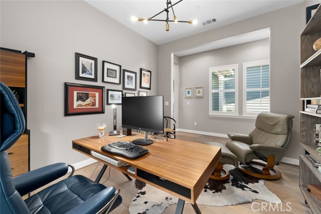 Modern Ranch meets California Coastal in this exquisitely upgraded Ventana floorplan, perfectly positioned to capture sweeping views of the vineyards, the shimmering lake and fountain, and the mountain range that frames the horizon. From sunrise to sunset, the scenery becomes a stunning natural backdrop—ever changing and always captivating. The home’s exceptional curb appeal sets an immediate impression of quality. Fresh exterior paint, stone-accented retaining walls, and a beautifully designed paver courtyard with a tranquil fountain create a welcoming entry that reflects the care and attention invested throughout the property. Inside, the chef’s kitchen features stylish white cabinetry with premium hardware, quartzite slab countertops, a generous island, a built-in refrigerator, and stainless appliances with a sleek range hood. The kitchen opens seamlessly to the great room, where a dramatic floor-to-ceiling stacked-stone fireplace adds warmth and architectural presence. Professionally designed interiors elevate every room. Automatic window treatments, plantation shutters, oak hardwood floors, and wallpaper-accented rooms create a sophisticated aesthetic. The optimized Smart-Space laundry room enhances convenience with custom cabinetry, a sink, and a built-in desk area along with a bay of cabinets in the garage for added storage. The outdoor living experience is a true highlight of this home. The covered patio functions as an additional living room, offering year-round comfort with a drop-down shade and generous space for dining or lounging. Beyond, paver pathways lead to a peaceful sitting area with built-in firepit overlooking the lake and fountain—an ideal vantage point to enjoy the reflection of the sun on the water and the dramatic silhouette of the mountains as the sky shifts throughout the day.