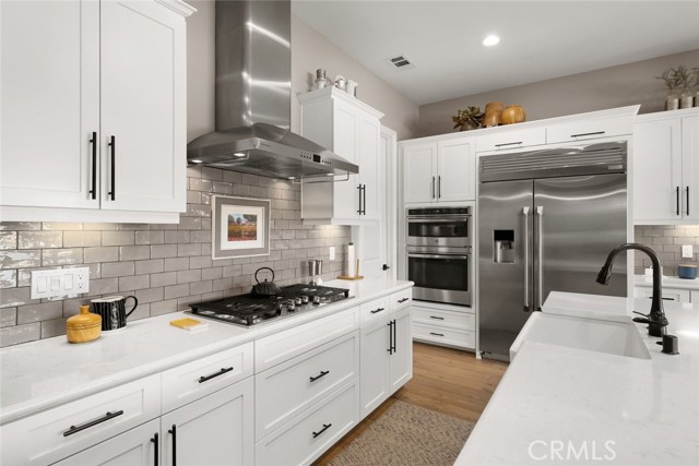 Modern Ranch meets California Coastal in this exquisitely upgraded Ventana floorplan, perfectly positioned to capture sweeping views of the vineyards, the shimmering lake and fountain, and the mountain range that frames the horizon. From sunrise to sunset, the scenery becomes a stunning natural backdrop—ever changing and always captivating. The home’s exceptional curb appeal sets an immediate impression of quality. Fresh exterior paint, stone-accented retaining walls, and a beautifully designed paver courtyard with a tranquil fountain create a welcoming entry that reflects the care and attention invested throughout the property. Inside, the chef’s kitchen features stylish white cabinetry with premium hardware, quartzite slab countertops, a generous island, a built-in refrigerator, and stainless appliances with a sleek range hood. The kitchen opens seamlessly to the great room, where a dramatic floor-to-ceiling stacked-stone fireplace adds warmth and architectural presence. Professionally designed interiors elevate every room. Automatic window treatments, plantation shutters, oak hardwood floors, and wallpaper-accented rooms create a sophisticated aesthetic. The optimized Smart-Space laundry room enhances convenience with custom cabinetry, a sink, and a built-in desk area along with a bay of cabinets in the garage for added storage. The outdoor living experience is a true highlight of this home. The covered patio functions as an additional living room, offering year-round comfort with a drop-down shade and generous space for dining or lounging. Beyond, paver pathways lead to a peaceful sitting area with built-in firepit overlooking the lake and fountain—an ideal vantage point to enjoy the reflection of the sun on the water and the dramatic silhouette of the mountains as the sky shifts throughout the day.