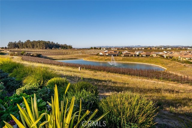 Modern Ranch meets California Coastal in this exquisitely upgraded Ventana floorplan, perfectly positioned to capture sweeping views of the vineyards, the shimmering lake and fountain, and the mountain range that frames the horizon. From sunrise to sunset, the scenery becomes a stunning natural backdrop—ever changing and always captivating. The home’s exceptional curb appeal sets an immediate impression of quality. Fresh exterior paint, stone-accented retaining walls, and a beautifully designed paver courtyard with a tranquil fountain create a welcoming entry that reflects the care and attention invested throughout the property. Inside, the chef’s kitchen features stylish white cabinetry with premium hardware, quartzite slab countertops, a generous island, a built-in refrigerator, and stainless appliances with a sleek range hood. The kitchen opens seamlessly to the great room, where a dramatic floor-to-ceiling stacked-stone fireplace adds warmth and architectural presence. Professionally designed interiors elevate every room. Automatic window treatments, plantation shutters, oak hardwood floors, and wallpaper-accented rooms create a sophisticated aesthetic. The optimized Smart-Space laundry room enhances convenience with custom cabinetry, a sink, and a built-in desk area along with a bay of cabinets in the garage for added storage. The outdoor living experience is a true highlight of this home. The covered patio functions as an additional living room, offering year-round comfort with a drop-down shade and generous space for dining or lounging. Beyond, paver pathways lead to a peaceful sitting area with built-in firepit overlooking the lake and fountain—an ideal vantage point to enjoy the reflection of the sun on the water and the dramatic silhouette of the mountains as the sky shifts throughout the day.