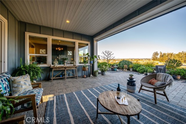 Modern Ranch meets California Coastal in this exquisitely upgraded Ventana floorplan, perfectly positioned to capture sweeping views of the vineyards, the shimmering lake and fountain, and the mountain range that frames the horizon. From sunrise to sunset, the scenery becomes a stunning natural backdrop—ever changing and always captivating. The home’s exceptional curb appeal sets an immediate impression of quality. Fresh exterior paint, stone-accented retaining walls, and a beautifully designed paver courtyard with a tranquil fountain create a welcoming entry that reflects the care and attention invested throughout the property. Inside, the chef’s kitchen features stylish white cabinetry with premium hardware, quartzite slab countertops, a generous island, a built-in refrigerator, and stainless appliances with a sleek range hood. The kitchen opens seamlessly to the great room, where a dramatic floor-to-ceiling stacked-stone fireplace adds warmth and architectural presence. Professionally designed interiors elevate every room. Automatic window treatments, plantation shutters, oak hardwood floors, and wallpaper-accented rooms create a sophisticated aesthetic. The optimized Smart-Space laundry room enhances convenience with custom cabinetry, a sink, and a built-in desk area along with a bay of cabinets in the garage for added storage. The outdoor living experience is a true highlight of this home. The covered patio functions as an additional living room, offering year-round comfort with a drop-down shade and generous space for dining or lounging. Beyond, paver pathways lead to a peaceful sitting area with built-in firepit overlooking the lake and fountain—an ideal vantage point to enjoy the reflection of the sun on the water and the dramatic silhouette of the mountains as the sky shifts throughout the day.