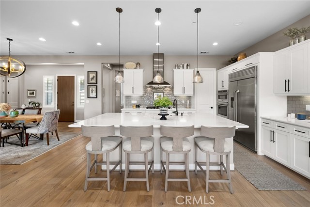 Modern Ranch meets California Coastal in this exquisitely upgraded Ventana floorplan, perfectly positioned to capture sweeping views of the vineyards, the shimmering lake and fountain, and the mountain range that frames the horizon. From sunrise to sunset, the scenery becomes a stunning natural backdrop—ever changing and always captivating. The home’s exceptional curb appeal sets an immediate impression of quality. Fresh exterior paint, stone-accented retaining walls, and a beautifully designed paver courtyard with a tranquil fountain create a welcoming entry that reflects the care and attention invested throughout the property. Inside, the chef’s kitchen features stylish white cabinetry with premium hardware, quartzite slab countertops, a generous island, a built-in refrigerator, and stainless appliances with a sleek range hood. The kitchen opens seamlessly to the great room, where a dramatic floor-to-ceiling stacked-stone fireplace adds warmth and architectural presence. Professionally designed interiors elevate every room. Automatic window treatments, plantation shutters, oak hardwood floors, and wallpaper-accented rooms create a sophisticated aesthetic. The optimized Smart-Space laundry room enhances convenience with custom cabinetry, a sink, and a built-in desk area along with a bay of cabinets in the garage for added storage. The outdoor living experience is a true highlight of this home. The covered patio functions as an additional living room, offering year-round comfort with a drop-down shade and generous space for dining or lounging. Beyond, paver pathways lead to a peaceful sitting area with built-in firepit overlooking the lake and fountain—an ideal vantage point to enjoy the reflection of the sun on the water and the dramatic silhouette of the mountains as the sky shifts throughout the day.