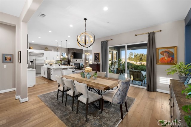 Modern Ranch meets California Coastal in this exquisitely upgraded Ventana floorplan, perfectly positioned to capture sweeping views of the vineyards, the shimmering lake and fountain, and the mountain range that frames the horizon. From sunrise to sunset, the scenery becomes a stunning natural backdrop—ever changing and always captivating. The home’s exceptional curb appeal sets an immediate impression of quality. Fresh exterior paint, stone-accented retaining walls, and a beautifully designed paver courtyard with a tranquil fountain create a welcoming entry that reflects the care and attention invested throughout the property. Inside, the chef’s kitchen features stylish white cabinetry with premium hardware, quartzite slab countertops, a generous island, a built-in refrigerator, and stainless appliances with a sleek range hood. The kitchen opens seamlessly to the great room, where a dramatic floor-to-ceiling stacked-stone fireplace adds warmth and architectural presence. Professionally designed interiors elevate every room. Automatic window treatments, plantation shutters, oak hardwood floors, and wallpaper-accented rooms create a sophisticated aesthetic. The optimized Smart-Space laundry room enhances convenience with custom cabinetry, a sink, and a built-in desk area along with a bay of cabinets in the garage for added storage. The outdoor living experience is a true highlight of this home. The covered patio functions as an additional living room, offering year-round comfort with a drop-down shade and generous space for dining or lounging. Beyond, paver pathways lead to a peaceful sitting area with built-in firepit overlooking the lake and fountain—an ideal vantage point to enjoy the reflection of the sun on the water and the dramatic silhouette of the mountains as the sky shifts throughout the day.