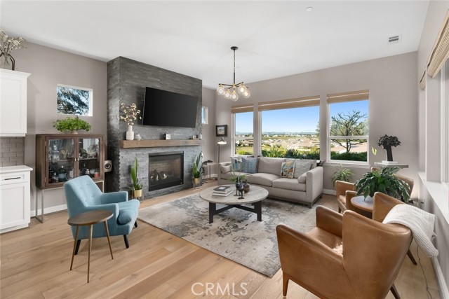 Modern Ranch meets California Coastal in this exquisitely upgraded Ventana floorplan, perfectly positioned to capture sweeping views of the vineyards, the shimmering lake and fountain, and the mountain range that frames the horizon. From sunrise to sunset, the scenery becomes a stunning natural backdrop—ever changing and always captivating. The home’s exceptional curb appeal sets an immediate impression of quality. Fresh exterior paint, stone-accented retaining walls, and a beautifully designed paver courtyard with a tranquil fountain create a welcoming entry that reflects the care and attention invested throughout the property. Inside, the chef’s kitchen features stylish white cabinetry with premium hardware, quartzite slab countertops, a generous island, a built-in refrigerator, and stainless appliances with a sleek range hood. The kitchen opens seamlessly to the great room, where a dramatic floor-to-ceiling stacked-stone fireplace adds warmth and architectural presence. Professionally designed interiors elevate every room. Automatic window treatments, plantation shutters, oak hardwood floors, and wallpaper-accented rooms create a sophisticated aesthetic. The optimized Smart-Space laundry room enhances convenience with custom cabinetry, a sink, and a built-in desk area along with a bay of cabinets in the garage for added storage. The outdoor living experience is a true highlight of this home. The covered patio functions as an additional living room, offering year-round comfort with a drop-down shade and generous space for dining or lounging. Beyond, paver pathways lead to a peaceful sitting area with built-in firepit overlooking the lake and fountain—an ideal vantage point to enjoy the reflection of the sun on the water and the dramatic silhouette of the mountains as the sky shifts throughout the day.