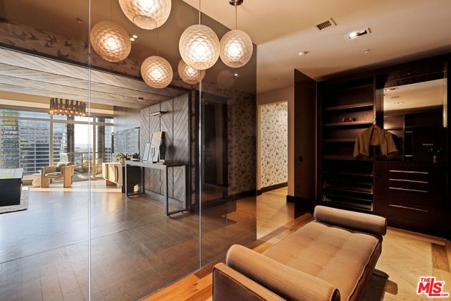The Penthouse Residence at the Evo - the most refined offering in downtown Los Angeles. Designed and curated by Hawk and Co. for the discerning palate; suspended ceilings and foyer of hand-troweled, Venetian plaster, chevron inlaid flooring, dual sided Fireplace, automated linen drapery, Poggenpohl cabinetry and Miele appliances. Each room is framed in floor to ceiling sliders that open to the downtown skyline. The home's lighting, shades, music and security are navigated with Control 4 smart home technology. 3 bedrooms, 4 bathrooms and +3,600 sq. ft. of indoor living space, perched on the 21st floor. One of the largest rooftop balconies in downtown, measuring over 2,500 sq. ft, puts the total living space at over 6,000 sq. ft. The home is scaled to be intimate enough for 2 - or expansive enough to entertain 200. Located in the heart of South Park, with easy access to the Crypto.com Arena, LA Live, the Orpheum, Bottega Louie, Whole Foods, and the finest eateries in the city. One block away, catch the Metro to Santa Monica, Hollywood or to Union Station with access to the entire coastline. The building has 24 hour security and concierge service, a rooftop pool, fitness center, some of the lowest HOA dues downtown and 3 side-by-side parking spaces on the ground floor (a rarity), which can be rented out to other residents for a monthly income, if desired. One of the most unique residences in all of downtown, with an attention to finish and sophistication that is unrivaled. Proximity and privacy - the city is yours.