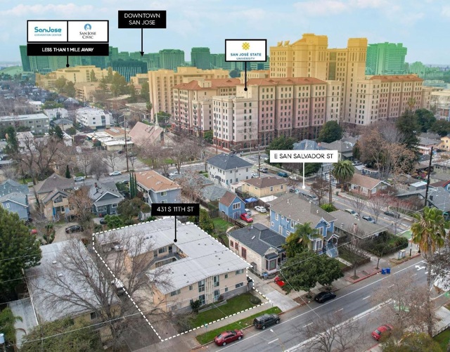 431 S 11th Street is a well-located 9-unit multifamily property in the heart of San Jose, just one block from San Jose State University and walking distance to Downtown San Jose. This two-story apartment building features a desirable unit mix of (3) 2BD/1BA units and (6) 1BD/1BA units. Amenities include on-site laundry and assigned carport parking. Recent capital improvements include a TPO membrane overlay roof replacement (2018) with a 10-year manufacturer warranty, plus replacement of wall heaters and the water heater. Property may offer future upside via potential conversion of the attached garage into an ADU for additional income (buyer to verify with City of San Jose). Strong location near major employers, dining, entertainment, and transit supports consistent renter demand.