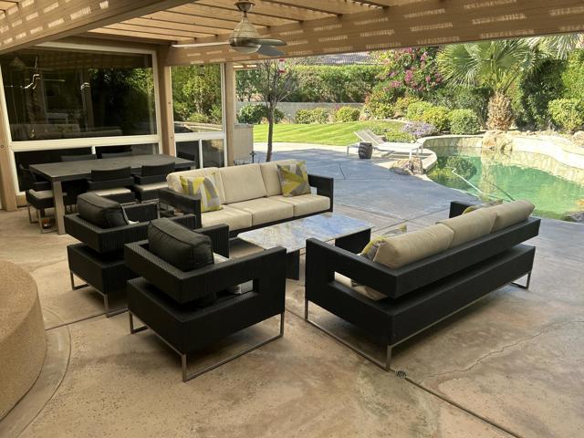 Available all Months! Located within the prestigious Rancho La Quinta Country Club, this exceptional home offers access to a state-of-the-art fitness center, community pools and spas, and a beautiful cantina for dining located at the main pool area.Set on a lushly landscaped 13,000 sq. ft. lot away from the golf course, the home welcomes you through a gated courtyard and custom double-door entry. Inside, the spacious floor plan features 4 bedrooms, a formal living room, elegant built-ins, surround sound, custom lighting, and a striking shadowbox faux copper fireplace. One bedroom includes office built-ins, while the dedicated office features French doors opening to a private side patio.The luxurious primary suite boasts a generous bathroom with marble countertops. The kitchen and bathrooms have been remodeled, and the home features custom paint throughout, along with a three-car garage.The resort-style backyard is ideal for entertaining, offering lush landscaping, a built-in barbecue, refrigerator, outdoor fireplace and bar, an expansive pool, sparkling spa, and a misting system for year-round comfort.A detached casita completes the property, featuring a living room, mini kitchen, beautiful bathroom, laundry area, and spacious bedroom with a queen bed--perfect for guests or extended stays.Call us today to book your stay. Pricing varies by season--please call for current rates.FYI: Owner is adding another queen bed to home. Office has a Pull out couch $5K & very comfortable.Professional photos will be coming shortly.