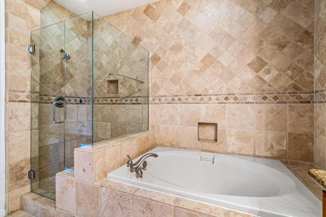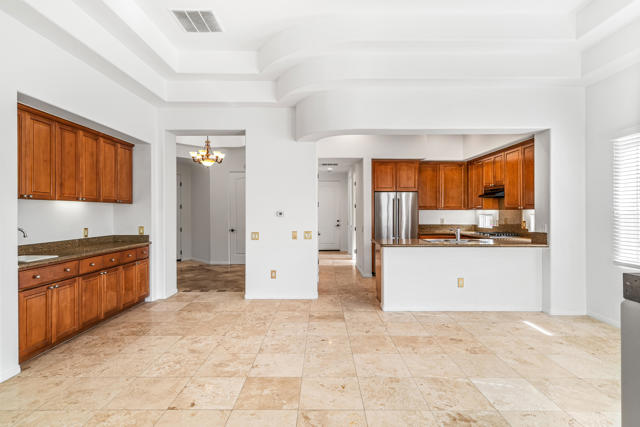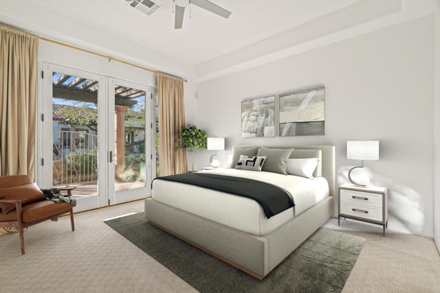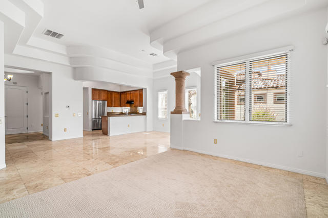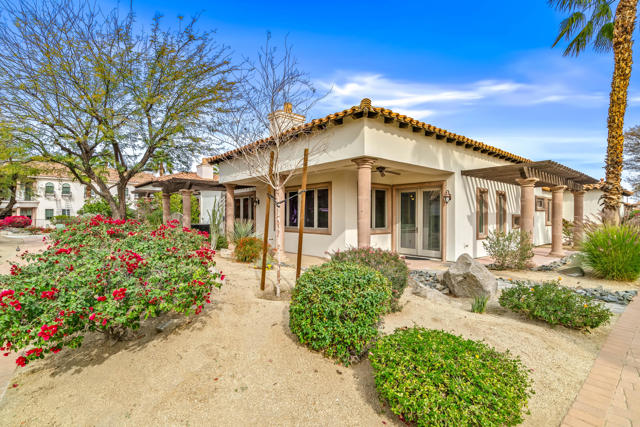 Welcome to Villa Portofino, a premier 55+ community in the heart of Palm Desert. This desirable Siena floor plan offers two bedrooms, two bathrooms, a den, living and dining rooms, fireplace, wet bar, and a wrap around patio. The home includes an attached two-car garage plus space for a golf cart.Elegant details include tray ceilings in the entry foyer, living room, and dining room; custom solid maple cabinetry throughout; and eight-foot Italian-design solid core interior doors. Travertine stone flooring highlights the entry, hallways, kitchen, dining room, bathrooms, and laundry room, with brand-new carpet recently installed in all remaining living areas.European-finished interior and exterior walls, custom stone accents, and classic Old World clay tile roofing enhance the home's timeless appeal. Eight-foot French doors and windows feature aluminum-clad exteriors, and energy-efficient Low-E insulated glass designed for desert living. Spa-inspired bathrooms showcase imported stone surrounds, including a primary bath with separate tub and walk-in shower.Additional features include R-38 ceiling insulation and insulated exterior, interior, and garage walls for enhanced temperature and sound control.Villa Portofino residents enjoy a 30,000-square-foot clubhouse with five-star resort amenities, including concierge services, movie theater, fitness center, bistro, pool, yoga studio, library, card and meeting rooms, and more. Ideally located near Eisenhower Medical Center, El Paseo shopping and dining, The McCallum Theatre, Whole Foods, Bristol Farms, and world-class restaurants.
