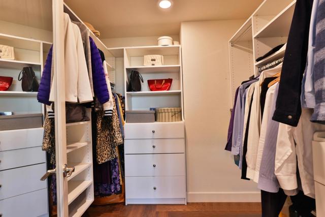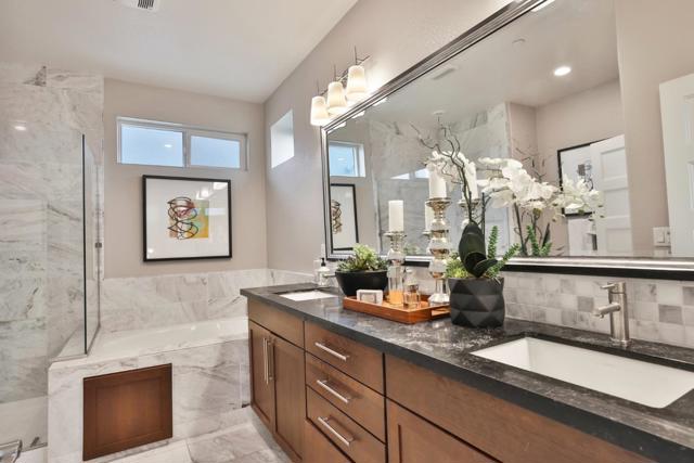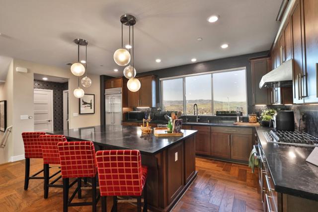 Located at the top of highly desirable Communications Hill, this former KB model home offers extensive upgrades and unobstructed views of the East Hills. Built in 2019, this detached single-family residence features 4 bedrooms, 3.5 bathrooms, and 2,518 square feet of living space. The interior showcases herringbone-pattern engineered oak hardwood floors, recessed lighting, and expansive windows. The open gourmet kitchen features black quartz countertops, a large island, and stainless steel KitchenAid appliances including a built-in refrigerator and five-burner gas range. The primary suite offers sweeping hill views, a private balcony, and a walk-in closet with custom built-ins. The spa-inspired bath includes dual quartz vanities and marble shower surrounds. A first-floor in-law suite provides flexibility with a built-in kitchenette, full bathroom, and three-panel bi-fold doors opening to a private backyard. Additional highlights include built-in entertainment cabinetry, a two-car garage with two EV chargers (including Tesla), owned solar, whole-house water filtration, and multi-zoned HVAC with an Ecobee thermostat. The backyard features drought-tolerant landscaping, low-maintenance turf, and unobstructed hill views, with easy access to parks, trails, and Highways 87 and 101.