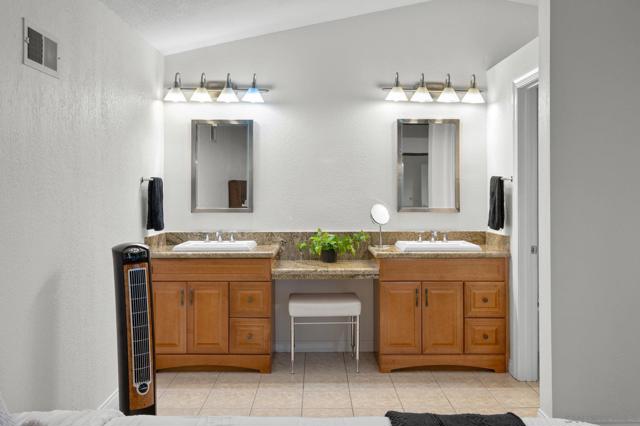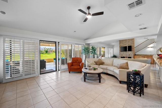 Welcome to your slice of paradise in The Woodhaven Country Club. Wake up to peaceful mornings and beautiful evenings on your private patio overlooking the 18th tee box and beautiful panoramic views of the mountains and stunning sunsets. This home is move in ready as a primary residence or a seasonal home or rental and is excellent for entertaining! Home was just updated with new paint, carpet, and ceiling fans. New light fixtures in the dining area and a freshly painted patio cover as well! Downstairs ensuite has the atrium converted to a spa style bathroom with dual showerheads, double sinks and upgraded bathtub. Optional 3rd bedroom, office or den downstairs as well with half bath and laundry closet. Open light and bright living area with granite countertops, stainless steel appliances, custom rock fireplace and double sliders to patio. Upstairs ensuite has a private balcony overlooking the golf course with stunning views! Enjoy the benefits of solar panels and a back up battery as well! This community has one of the lowest HOA fees in the desert which includes premium cable and internet services, water, trash and landscape maintenance as well as 4 pools and hot tubs, golf, pro shop, game room, tennis, pickle ball, fitness center, restaurant and lounge and banquet facilities. This amazing golf course is a semi-private course open to the public and boasts pristine lakes and gorgeous waterfalls with plush fairways and finely manicured greens. This property is turnkey and a must see!