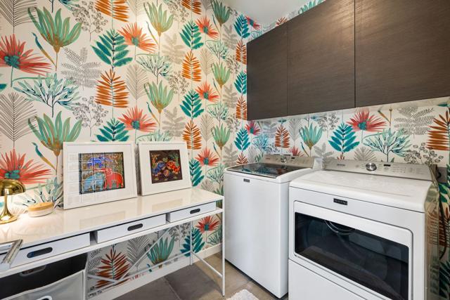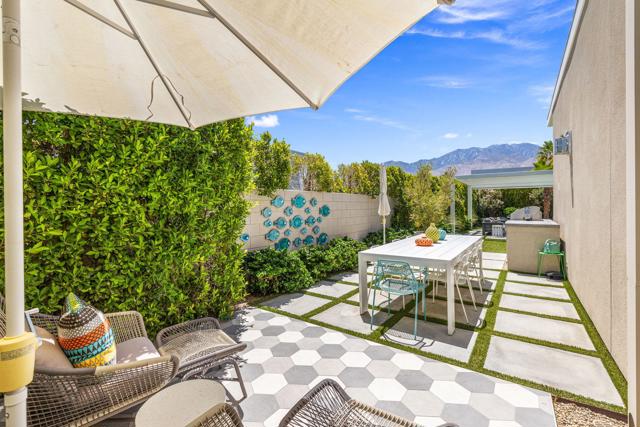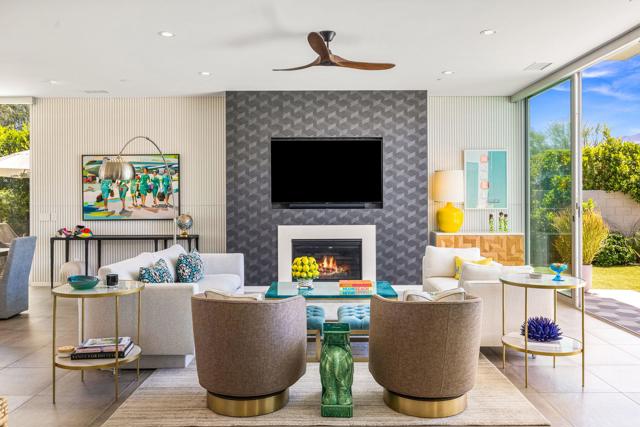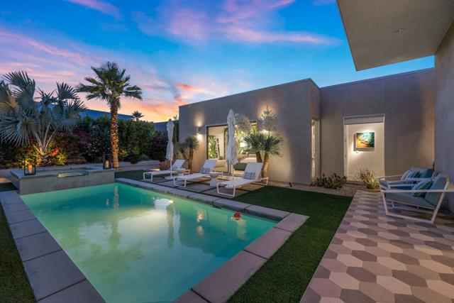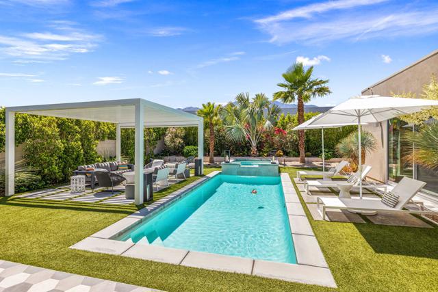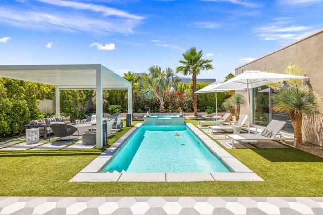 FEATURED IN THE 2025 MODERNISM WEEK SIGNATURE HOME TOUR--ONE OF JUST TWO NEWER-BUILT HOMES SELECTED. This true Palm Springs gem located in the highly sought-after Escena community is extensively upgraded, blending sophisticated design with cutting-edge technology. An open-concept floor plan is bathed in natural light, creating a bright and airy atmosphere that highlights the home's clean lines and modern finishes. Expansive Fleetwood sliding glass doors open to a private outdoor oasis, offering seamless indoor-outdoor living that is perfect for entertaining and everyday enjoyment.The resort-style backyard features a stunning pool and spa, an outdoor shower, built-in Fisher & Paykel BBQ, gas fire pit, a beautifully designed pergola with a solar-powered motorized shade, and an array of lounge areas - ideal for hosting gatherings or unwinding under the desert sky. Inside, the chef's kitchen is anchored by a large quartz island, complemented by stainless steel appliances and bold, stylish finishes that add character throughout the home. A gas interior fireplace adds warmth and ambiance to the main living area, while California Closet systems in the Primary, Garage, and Entry Closet provide seamless organization throughout.This residence has been significantly upgraded with a complete smart home environment, including Control4 climate and lighting control, Sonos sound system inside and out, automated Somfy window shades, a water softening system, and a 37-panel financed solar system for energy efficiency and long-term savings.Thoughtfully designed for both comfort and entertaining, this exceptional property captures the essence of Palm Springs living at its finest.