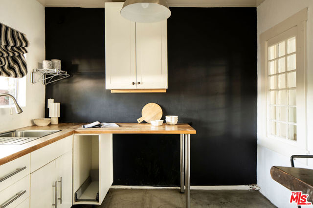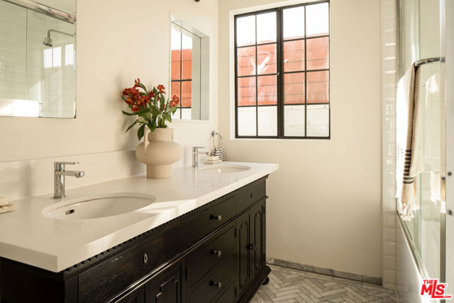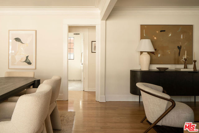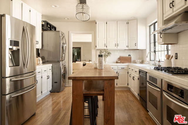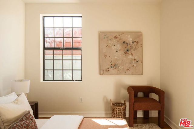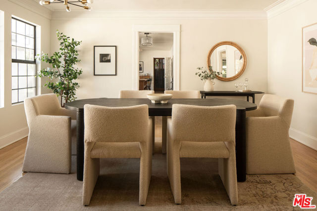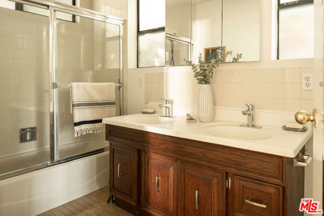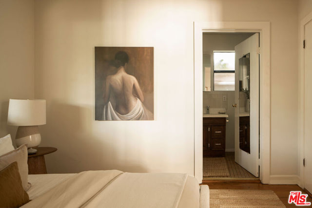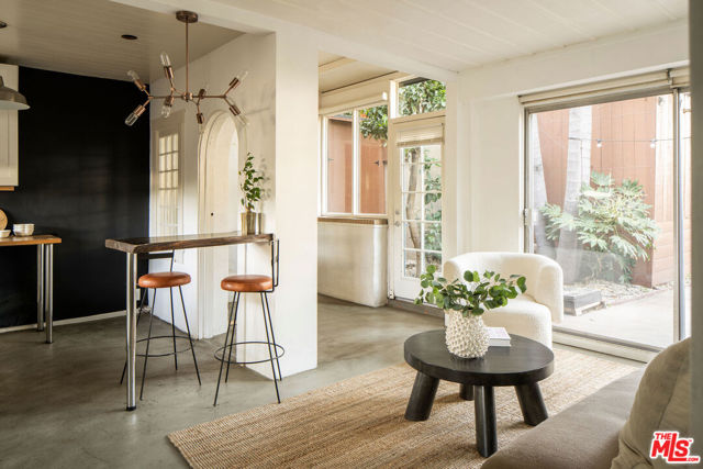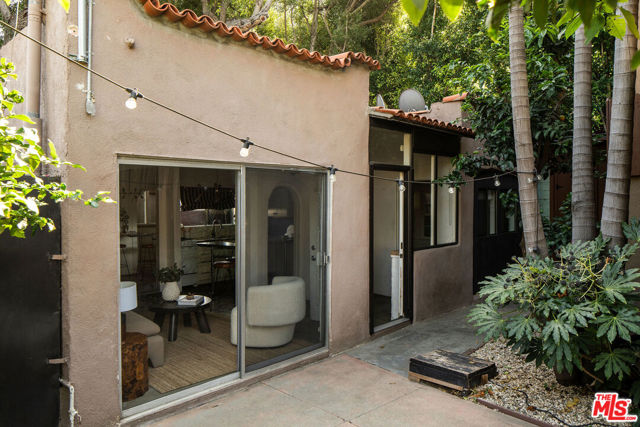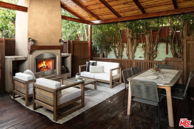 Sunset Square Spanish Hedged + Gated Retreat with lush landscaping, 4 beds + 2 baths in the main house & a 1 bed/1bath back house in the yard. Front courtyard outdoor living room has a stacked tile waterfall flanked by majestic banana trees and surrounded by mature plants. A covered patio and a wide character screened front door takes you into the home. A spacious living room with (decorative) fireplace opens to the dining room, all bathed in sunshine. The kitchen has double sinks, double convection ovens, and a high butcher block island that doubles as a breakfast bar. The kitchen has a stacked washer dryer and it opens to the breakfast room. The 2 bedrooms at the front of the house share a remodeled bathroom off the hallway with a handsome wood double vanity that has 2 sinks and lots of storage & a bath with shower. There are 2 additional true bedrooms at the back of the house - one is an en suite bedroom and the other is currently staged as an office. The house has central HVAC, new copper plumbing, newer water heater, hardwood floors, and a long driveway with tandem four car parking. There's an outdoor patio at the back of the house with a wood deck + a soaring pitched ceiling overhead + an outdoor fireplace - it offers so much space for both dining and living. On the back property line is a spacious & private one bedroom apartment back house that has a foyer, living room, eat-in kitchen, bedroom and full bathroom. The location is prime, near coffee shops, Trader Joe's, Bristol Farms, open-air restaurants, and world-class nightlife on Sunset. Lush landscape throughout includes soaring swaying palm trees, fruit trees, ficus trees, and more. Truly feels like a relaxing green compound oasis right in the heart of the city!
