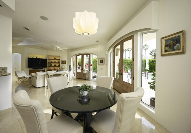 Elegant large Mediterranean home in Indian Wells Country Club just a short cart ride from the golf course and Clubhouse. Quiet cul-de-sac location, bright south-facing Santa Rosa mountain views, serene garden setting and extremely private, this showcase residence sits on almost half an acre of mature landscaping with date palms, ficus, pomegranate, natal plums and agave. The residence comprises 3,832 square feet, 4 ensuite bedrooms and 5 baths, with the grounds including a large triangular pool with double waterfall, and huge patio plus sunken fire pit for those starry desert evenings. Built in 2002 the property had numerous updates by meticulous owner in 2023, including new 3-zone HVACs, pool equipment, windows, flooring, security, and exterior fixtures. This stunning home offers an easy flow from formal entertaining areas beginning with a soaring grand entry foyer and chandelier to more casual family living spaces with multiple French doors, archways, and spectacular lighting. Custom features include built-ins and art display areas, a bar, spa-like primary bath and large walk-in closet, GE Monogram appliances, recessed accent lighting, Sonos surround sound with ceiling speakers, a shaded rear patio with fans, triple garage with AC, and even a pool chiller! Rare opportunity to walk in with no projects and just enjoy all the benefits of living in Indian Wells. Offered furnished. Owner is agent.