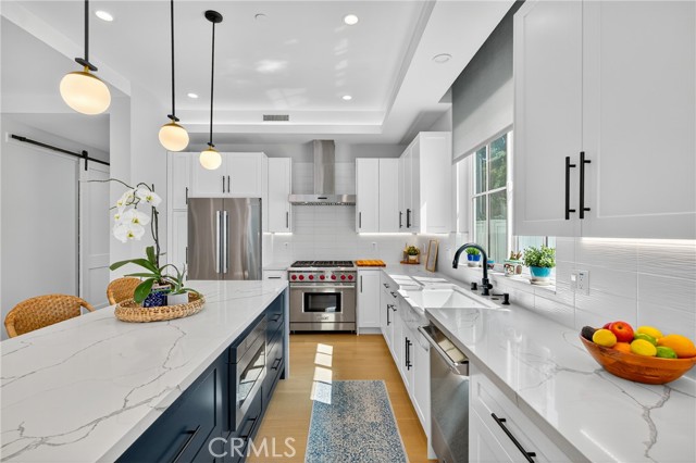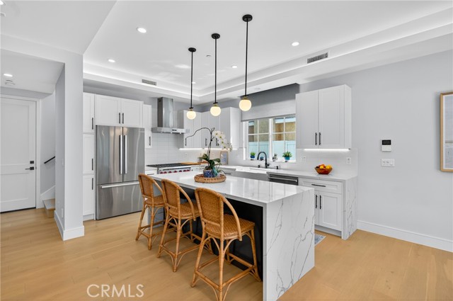 Welcome home to this stunning, detached townhome built in 2022! Upon entering, you'll be greeted with soaring ceilings, tons of natural light, and beautiful hardwood floors. An open floor plan features a spacious living room with fireplace, wet bar with wine fridge, dining area big enough for entertaining, powder room for guests, and a Chef's kitchen with an eye-catching island. Some of the highlights of the kitchen are a Wolf 6-burner gas range and hood, Bosch fridge, and convenient pantry. A private south-facing backyard space is perfect for dining al fresco or hosting a barbecue. Upstairs, you'll find an additional den space great for a reading nook or play space, two balconies, washer and dryer, and all 4 bedrooms. The primary suite features vaulted ceilings, a fireplace, and balcony access. The primary bath is a true spa-like retreat with dual vanities, skylight, large shower, and soaking tub. There is an additional bedroom with en suite bath on this level, as well as a guest bath for the other two bedrooms to share. But that's not all! This home has all the bells and whistles - OWNED solar providing incredible electricity savings, a 5-speaker sound system with music receiver, window treatments with remote control and programming capability, LED lighting, Doorbird front door video system, 5 camera security system, central vac, tankless water heater, automated irrigation system, an epoxy-floored 2 car garage with remotely controlled garage door convenient for deliveries when not at home, pre-wiring for an EV charger, and thoughtful storage spaces and excellent floorplan functionality throughout. A quiet street away from busy roads with a stellar location just one block from Anderson Park and fantastic Lincoln Elementary, 4 minutes from the 405 freeway, and only 2.5 miles from downtown Manhattan Beach. Top rated schools and the irresistible South Bay lifestyle await - what are you waiting for? Come and see this better-than-new-construction home and find the special one for which you've been searching for! Please note sellers are looking to sell most of the furniture - please inquire if interested.