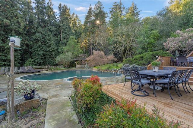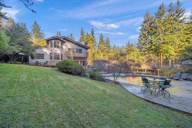 Stunning mountain home set in a prime location just minutes from downtown Los Gatos. The open, spacious floor plan features a luxurious living room with soaring ceilings and a fireplace, opening seamlessly into the formal dining area, perfect for entertaining. The gourmet kitchen is appointed with double ovens, a gas cooktop, and a large center island. The family room includes a second fireplace and direct access to the rear yard. The main level is completed by a generous bedroom and an updated full bathroom with a walk-in shower. Upstairs, the primary retreat offers a large ensuite bath with a soaking tub with jets and a separate shower. Two additional spacious bedrooms complete the upper level. The grounds include a sparkling pool with a waterfall, an outdoor kitchen, and a barn for the horse enthusiast. An attached 2-car garage plus a detached 2-car garage/workshop provide ample parking and storage. Served by top-rated schools: Loma Prieta, C.T. English, and Los Gatos High.
