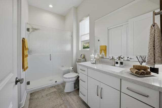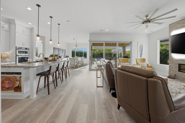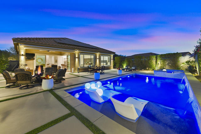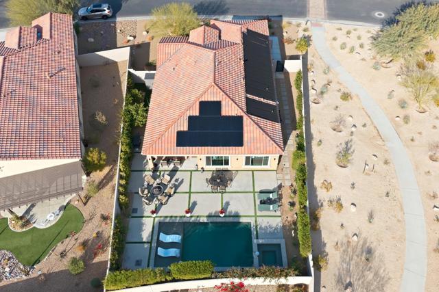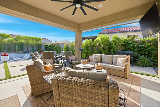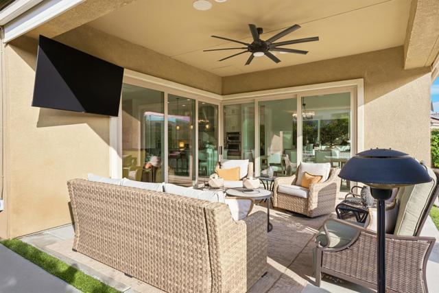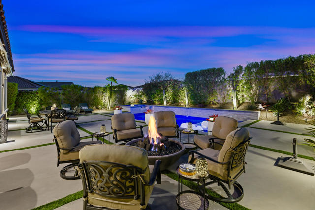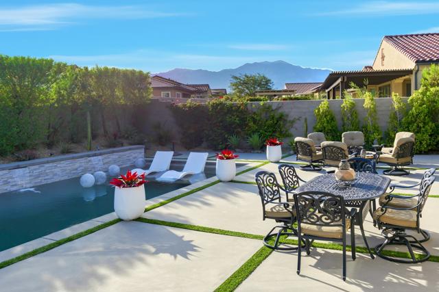 This expanded Sanctuary floor plan--one of the most coveted and rarely available designs within the community--offers a refined blend of sophistication, comfort, and seamless indoor-outdoor living. Thoughtfully designed with two bedrooms and two and a half baths, the home includes a dedicated office enhanced with a custom built-in Murphy bed, providing exceptional flexibility for guests while maintaining an elegant workspace. From the moment you enter, you'll appreciate the extensive upgrades throughout the residence. High-end finishes, custom built-ins, and an expansive use of tile create a cohesive, polished aesthetic. The heart of the home is anchored by the great room and dining area, both featuring oversized double sliding glass doors that open effortlessly to the outdoor living space, filling the home with natural light and creating a true resort-style ambiance. The south-facing backyard is a private retreat, meticulously designed for both relaxation and entertaining. Enjoy year-round sunshine alongside a sparkling pool and spa, a stylish fire pit for evening gatherings, and beautifully executed low-maintenance landscaping that enhances privacy without sacrificing beauty.Pool & Spa are Solar Heated. Whether hosting guests or enjoying quiet desert mornings, the outdoor space offers an exceptional extension of the home's luxury living. Every detail has been carefully curated to deliver an elevated lifestyle, making this residence ideal for full-time living or a sophisticated desert escape. Residents of Del Webb Rancho Mirage enjoy access to world-class amenities including a stunning clubhouse, resort-style pools and spa, state-of-the-art fitness center, golf course, tennis and pickleball courts, walking trails, and a vibrant social calendar--offering an unparalleled active adult lifestyle in one of the Coachella Valley's most desirable communities.