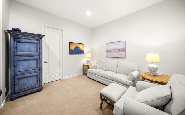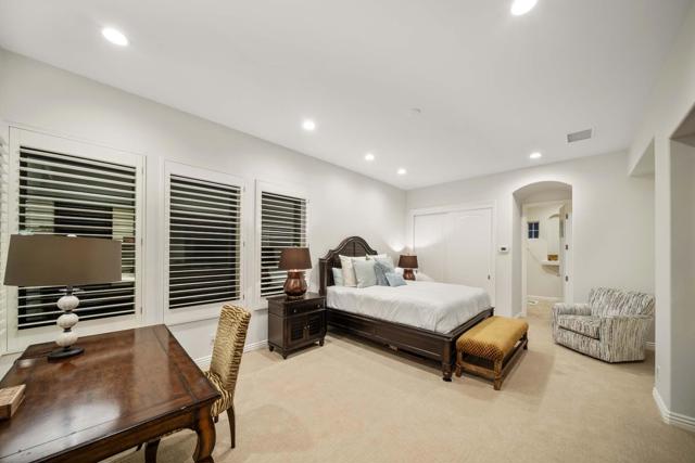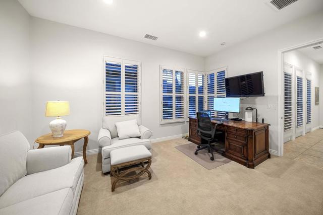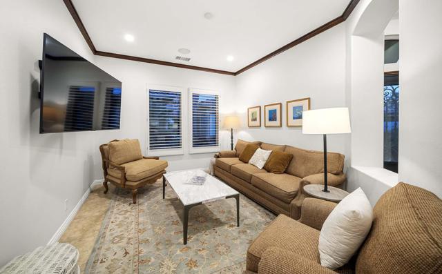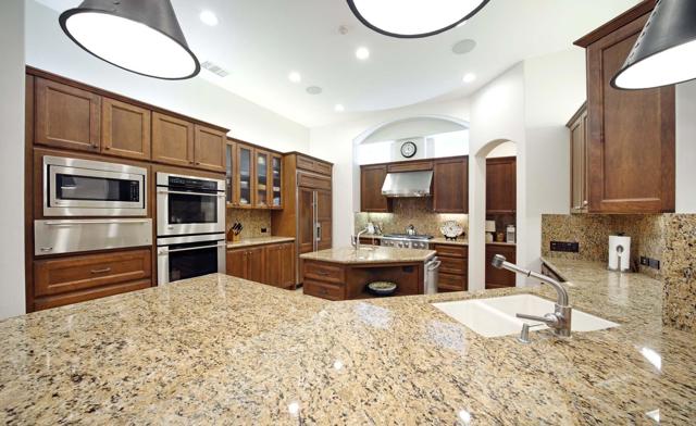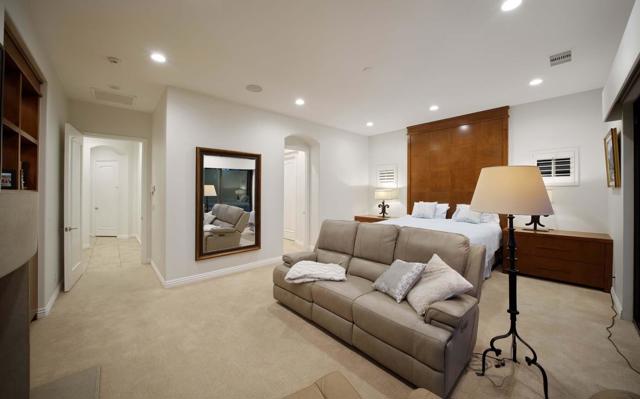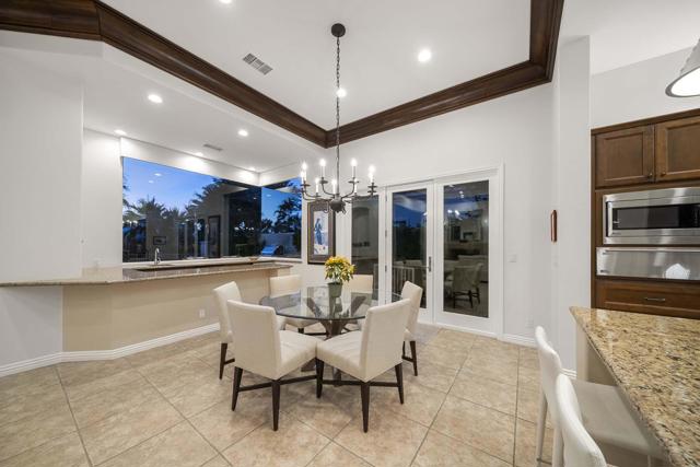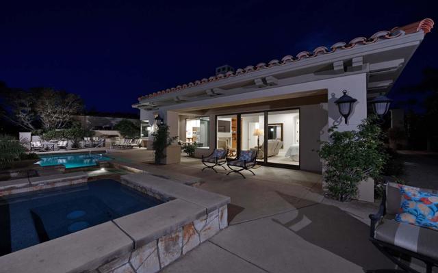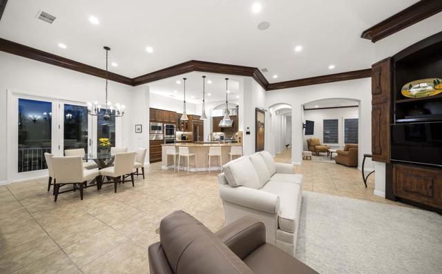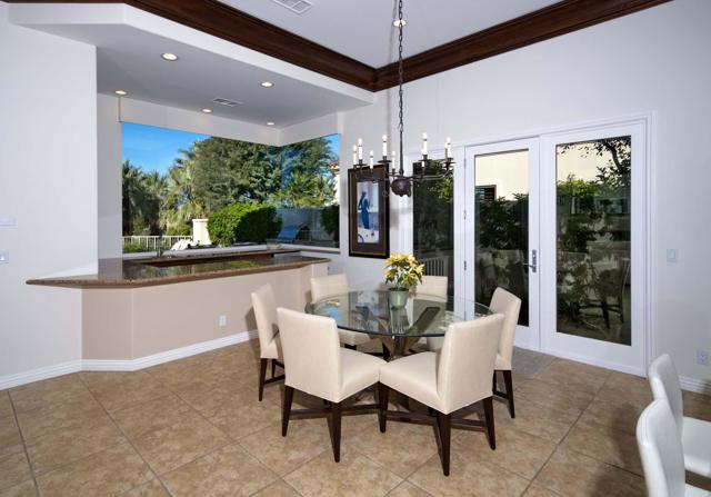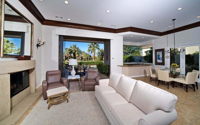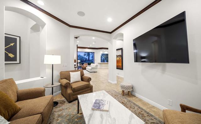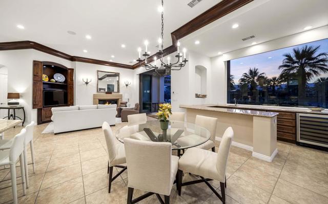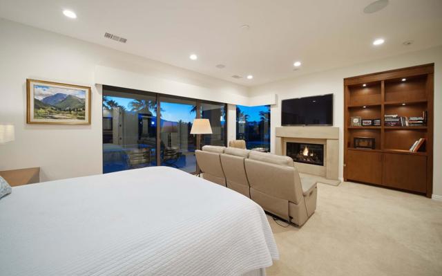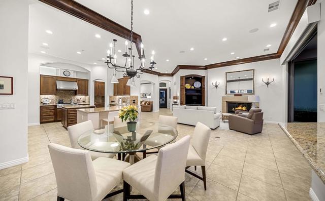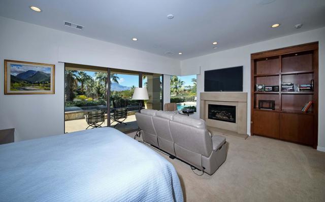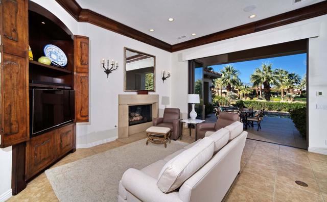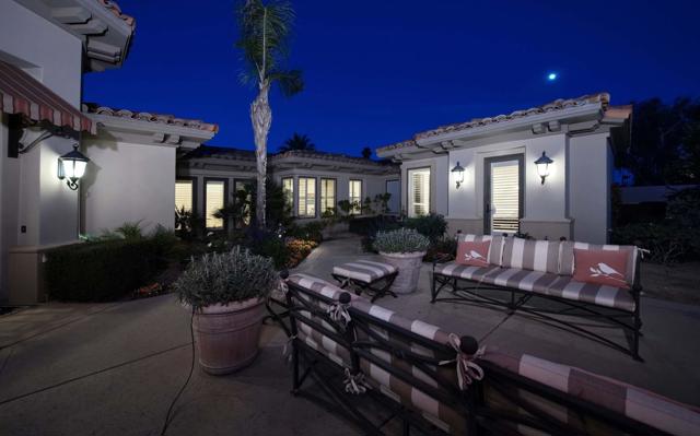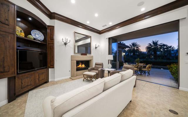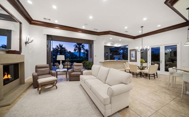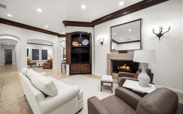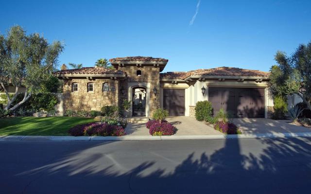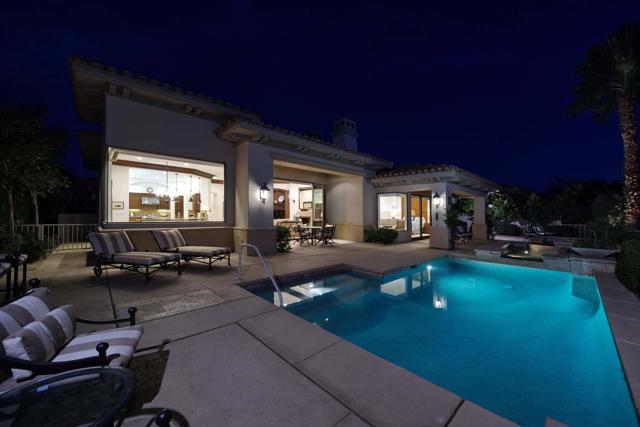 This beautiful home inside Toscana Country Club offers gorgeous western views of the desert mountains, lake, and the Jack Nicklaus Signature Golf Course. The welcoming courtyard includes a sitting area with a dramatic outdoor fireplace that connects the private guesthouse and the main home. Inside, the residence showcases refined finishing details throughout, including finely crafted built-ins, custom crown molding, beautiful light fixtures, and a Control4 home automation system providing remote access to HVAC, security, lighting, and pool functions. Additional highlights include owned solar and a complete HVAC replacement in 2022.The great room features 10-foot stacking doors that seamlessly blend indoor-outdoor living, along with a breakfast nook, formal dining area, fireplace, and wet bar ideal for entertaining. The gourmet kitchen offers abundant cabinetry, an island with separate breakfast bar, and premium high-end appliances, including double ovens, a range with hood, and a cabinet-panel refrigerator.The primary suite offers a luxurious bathroom with soaking tub, large shower, and a private covered patio overlooking the custom pool and spa. Guests will enjoy a private detached guesthouse with a sitting room and en-suite bath, as well as additional main-home guest bedrooms, each with its own en-suite bath.
