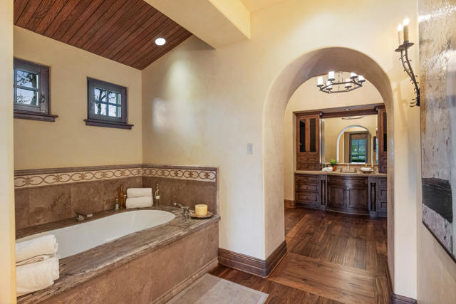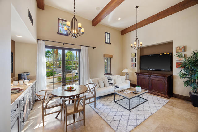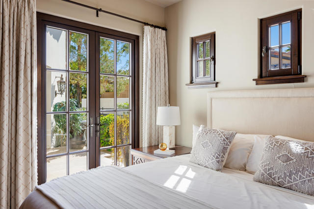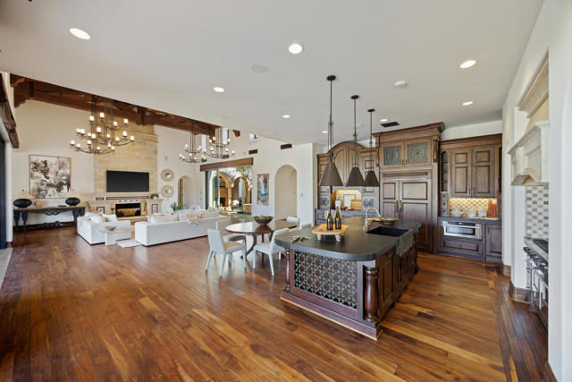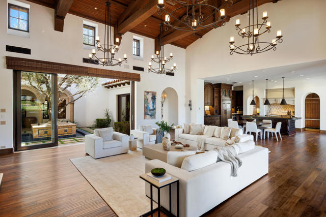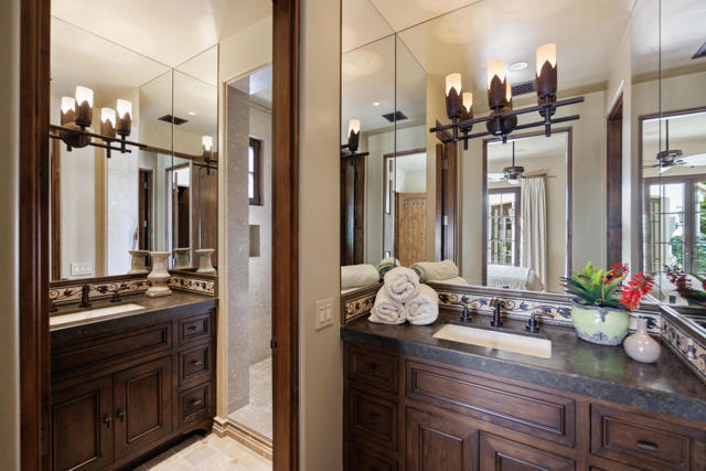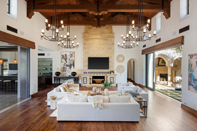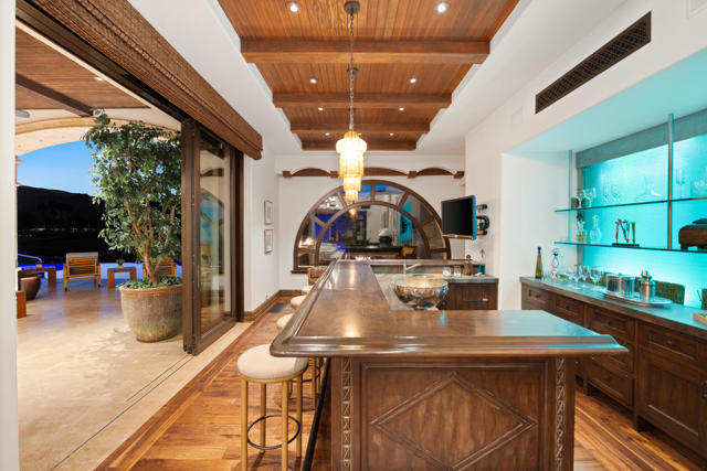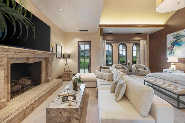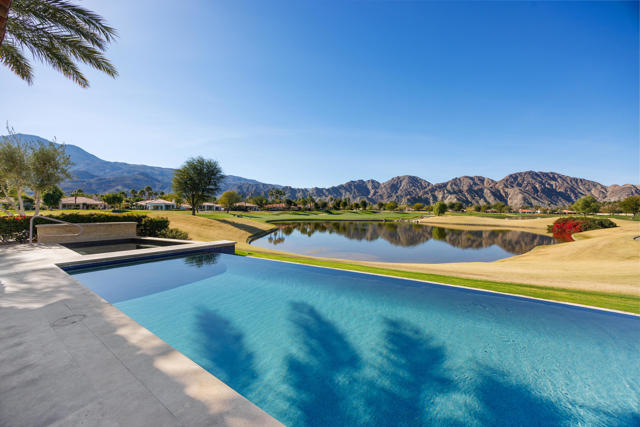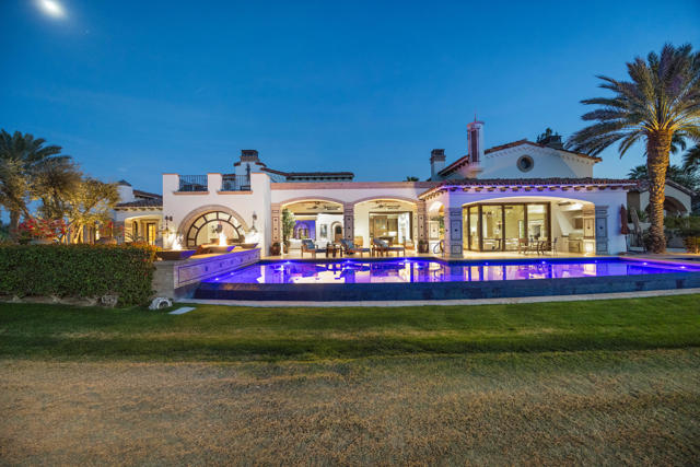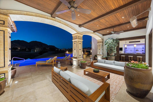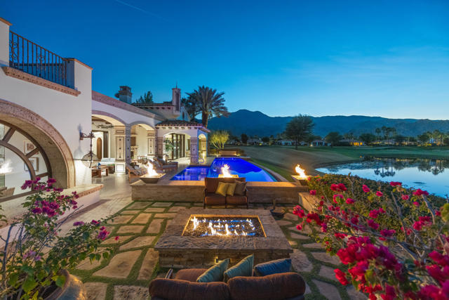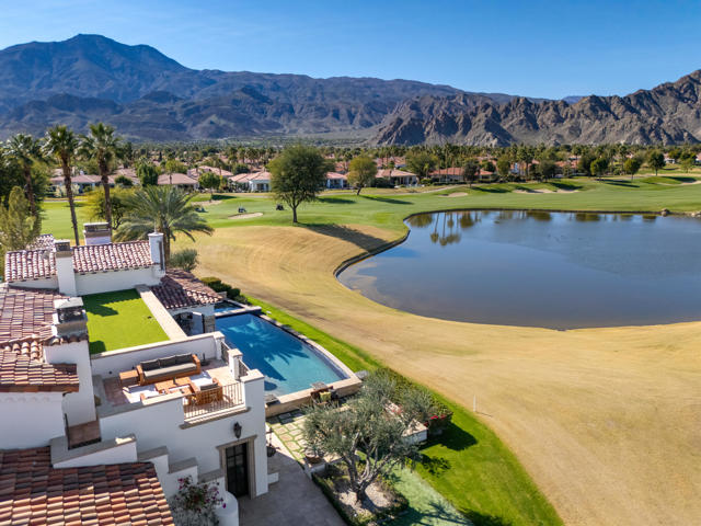 The Peninsula Estate: Occupying one of the most commanding positions in PGA West, this Spanish architectural residence is defined by scale, craftsmanship, and uninterrupted water, mountain, and triple-fairway views.Inspired by Hotel Alfonso XIII in Seville, Spain, the estate reflects European resort sensibility translated into a private setting designed for grand entertaining and refined living. Positioned on over half an acre, a residence with this level of finish, setting, and architectural intent is seldom introduced.An infinity-edge pool and spa overlook the lake, fairways, and Santa Rosa Mountains, complemented by expansive patios with upper and lower lighting, multiple fire features, limestone and Cantera stone detailing, and a rare sky deck with fireplace.A dramatic great room with 19-foot ceilings anchors the home, featuring a massive floor-to-ceiling limestone fireplace framed by wood-clad retractable pocket doors. The kitchen is designed without compromise, offering Viking appliances, Sub-Zero refrigeration, a generous island, custom cabinetry, and a fully appointed butler's pantry with additional appliances.The formal dining room evokes a private wine cellar with panoramic views, tumbled brick barreled ceilings, a striking fireplace, and dual two-story glass wine towers with a see-through floor extending to the lower-level media/wine tasting room.The primary suite is expansive and privately oriented, capturing remarkable views and featuring a fireplace and dedicated patio--creating a quiet yet substantial retreat within the home's broader scale. An open-air interior courtyard with fireplace, sculptural olive tree, and fountain connects the main residence to a well-appointed two-bedroom, two-bath casita with living area and kitchenette.Additional highlights include a mahogany full-service bar, two additional ensuite guest bedrooms, elevator service to the lower level and main floor, newly refinished wood floors, an oversized four-car lower-level garage, mature landscaping with new lighting, and a private executive office with views.A residence of this caliber is rarely available. Offered now for the first time.