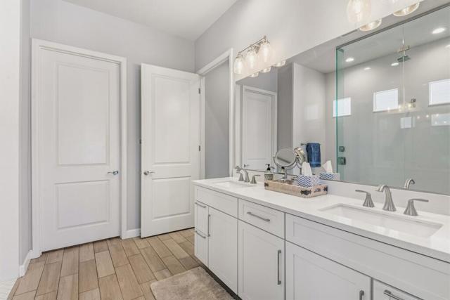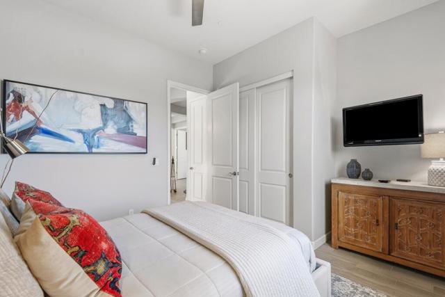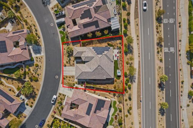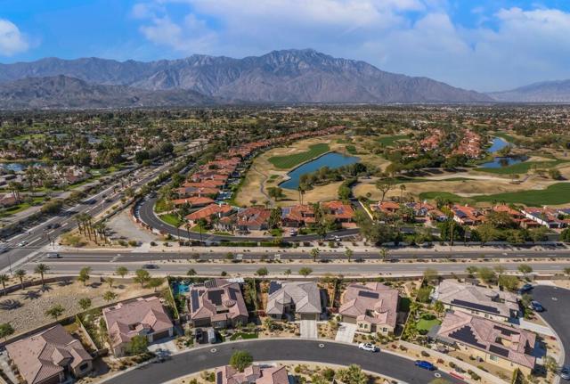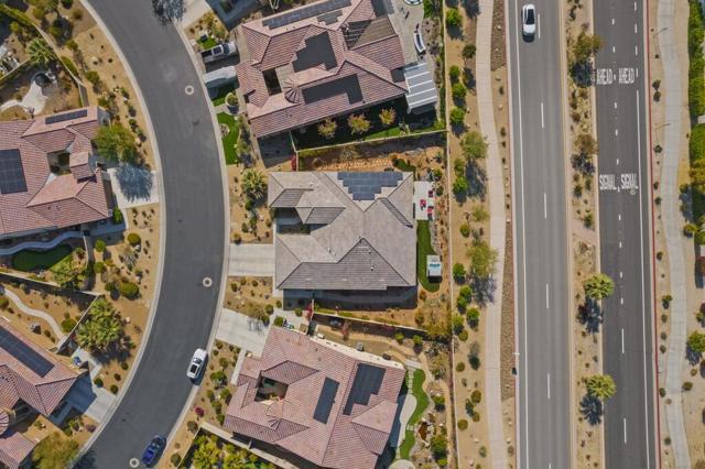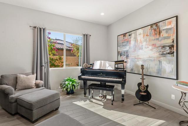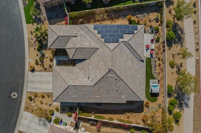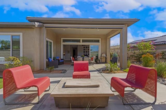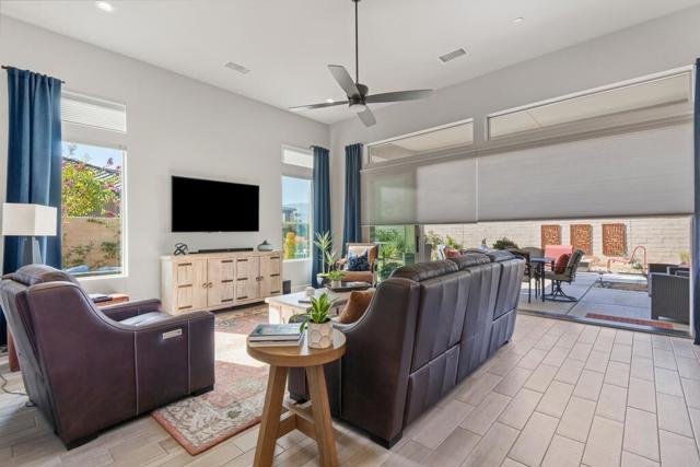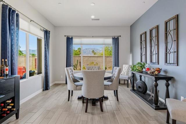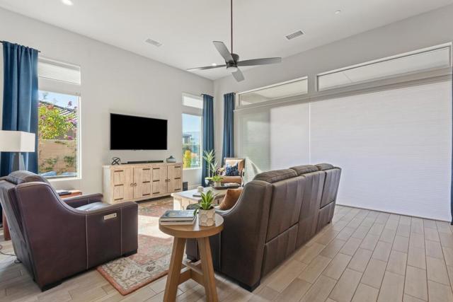 Del Webb Rancho Mirage is the premier 55+ community with walking trails, expanding views and convenient shopping and dining. Residents enjoy a low HOA fee that includes high speed internet, cable and streaming services. Clubhouse, pools, tennis courts, pickleball, putting green, fitness center and endless social activities and events. 77 Barolo Phase 1, Plan 3 Serenity home captures panoramic mountain views- all enhanced by OWNED SOLAR and thoughtful upgrades throughout. Inside, the open-concept layout features two bedrooms, TWO ADDITIONAL ROOMS for a den/office/media rooms, and two baths - Wood-look tile flooring, custom window treatments, tankless water heater and owned water softener. The chef's kitchen is the center of the home with upgraded KitchenAid appliances - including a built-in refrigerator - 42'' upper cabinets with crown molding, and executive island with extra storage, and double-honed granite countertops. The primary suite has quartz walk-in low threshold shower with a bench, dual vanities and a generous walk-in closet. The guest bedroom provides privacy for visiting friends and family. The home also has a Multi panel sliding door in the family room which leads to an outdoor patio with automatic outdoor screens which create an indoor/outdoor living/dining area.Step outside to a stunning, fully landscaped backyard oasis perfect for year-round desert living. Enjoy the panoramic mountain views, gather around the built-in firepit, or enjoy the above ground jacuzzi.