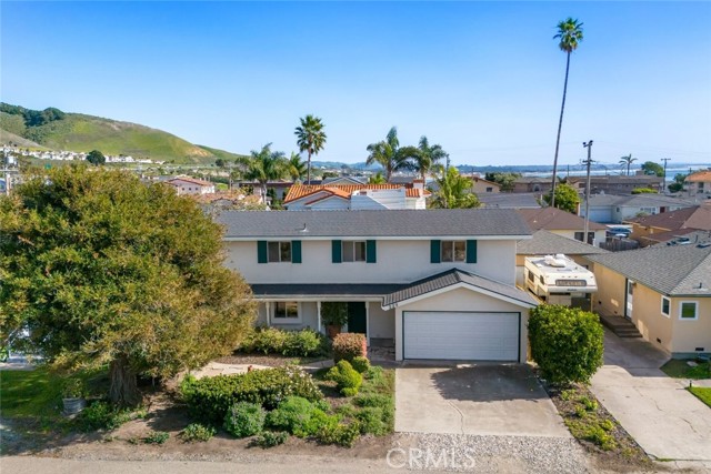 Relaxed seaside living! This thoughtfully designed coastal residence captures peek-a-boo ocean views, with lush, mature landscaping. A charming covered front porch and concrete patio create an inviting first impression, perfect for enjoying the coastal breeze and golden hour sunsets. Inside, the living room is warm and timeless, featuring custom built-in bookshelves, a window seat, and a wood-burning fireplace. Terra cotta tile flooring flows effortlessly from the entry through the dining room and into the kitchen, enhancing the home’s natural warmth and continuity. The dining room opens to both the backyard and kitchen through elegant French doors, ideal for entertaining and everyday living. The kitchen offers abundant counter and storage space, stone countertops, a dishwasher, gas range with microwave hood combo, and a refrigerator with coffee bar. A bright breakfast nook overlooking the backyard provides a welcoming space to start the day. Outdoor living shines with a concrete patio accented by brick detail—an ideal setting to unwind while taking in the sea air. A mature citrus tree anchors the space, while additional greenery and lawn offer room for relaxation or recreation. The downstairs primary suite features a ceiling fan, sliding door access to a private flagstone paver patio, and an ensuite bath with walk-in shower. Also on the main level are two additional bedrooms (one currently used as a dedicated office with built-in storage and skylight), and a full bath. A downstairs laundry room with storage doubles as a convenient mudroom with garage access. Upstairs, you’ll find a second spacious primary suite with an ensuite bath featuring a vanity area and full bath. A fifth bedroom adds even more flexibility. An additional vanity area off the upstairs hall connects to the ensuite shower and toilet via a privacy door—such a thoughtful and unique touch. With a great layout Ideally located close to the beach, local parks, hiking trails, shopping, dining, and entertainment in Pismo Beach—this is one you won’t want to miss.