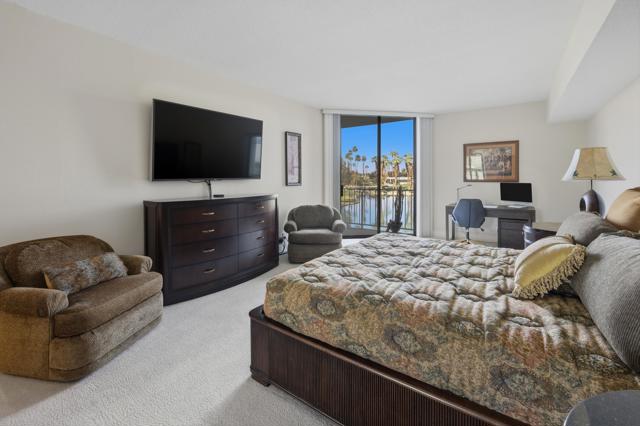 Serene Lakefront Views through 9-ft walls of windows. Lots of upgrades include marble flooring, custom cabinetry, granite counters with breakfast bar, newer stainless-steel appliances and tankless water heater all within this popular dual primary-bedroom suite floor plan offering generous sized rooms and promises a blend of comfort and tranquil views. Enter formal foyer leading to living room with modern look-gas fireplace and built-in wet bar & game area with beverage refrigerator. All rooms offer access to the covered terrace with gas-jet for BBQ perfect for entertaining or just relaxing. The spacious main suite bathroom offers dual vanity, granite-clad counters, and a large walk-in shower, along with private water closet.Desert Island stands as a distinctive high-rise condominium community on a lush, 25-acre private island encircled by a sparkling lake and a lush green 18-hole championship golf course. Residents enjoy beautifully landscaped park-like grounds with walking paths, fruit trees, seating areas, tennis and pickleball courts, heated swimming pools and spas, pedal boats, fishing facilities, and secure 24-hour guard-gated entry. The HOA fees cover on-site management, central air-conditioning, water, gas, trash, Spectrum cable TV, Wi-Fi Internet, and the maintenance of landscaping and common areas, providing a low-maintenance, carefree lifestyle. Conveniently located close to shopping, dining, theaters, galleries, and casinos, with easy access to Eisenhower Medical Center. Schedule your showing today and discover why this home is not just a property, but a place to create lasting memories!