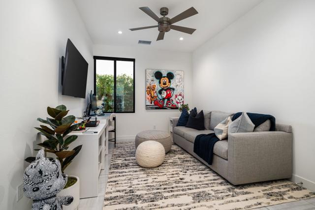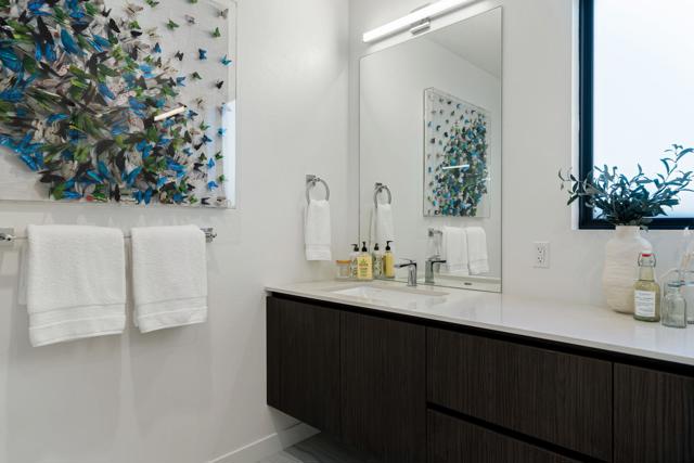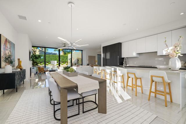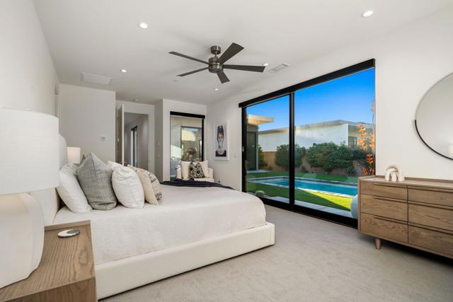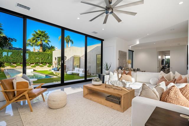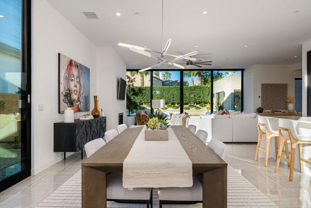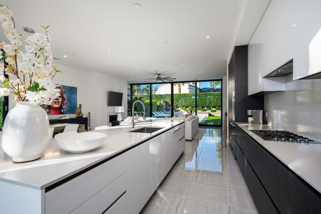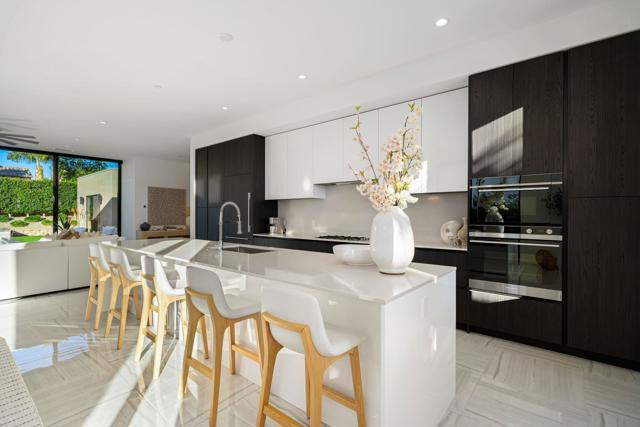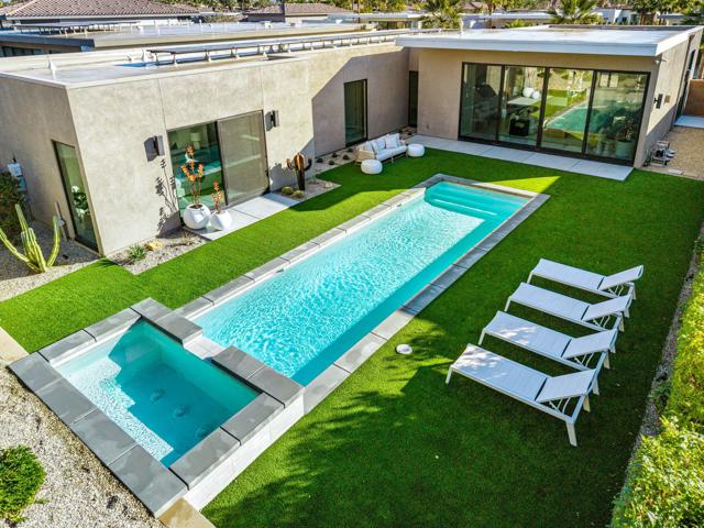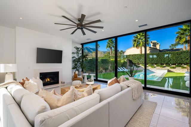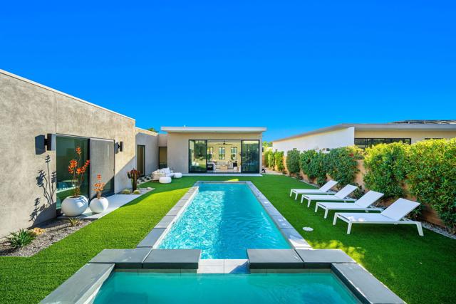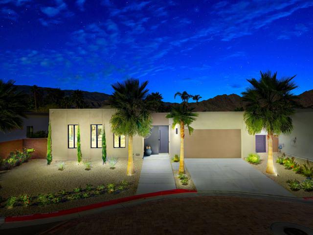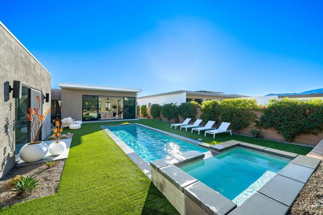 Welcome to this modern residence located at Coral Mountain in La Quinta. Upon entry, layered glass panels connect the interior to the outdoor spaces, creating a strong indoor outdoor flow. A gallery style hallway provides a clean, architectural backdrop for art and design. The home offers abundant natural light and open, well proportioned living areas. Walls of glass open to the outdoor living area featuring a lap pool, raised spa, fire pit, and landscaped surroundings, suitable for both entertaining and everyday use. The kitchen features Fisher & Paykel black glass appliances, Silestone quartz countertops, and Italian cabinetry, designed for both function and style. This beautifully designed residence offers three spacious bedrooms plus a dedicated home office with a closet that can easily function as an optional fourth bedroom, along with four bathrooms. Additional features include Aquabrass fixtures, a Swiss made Laufen soaking tub, and a spacious primary suite with a walk in closet. The home is being sold fully furnished, providing a turnkey opportunity to move in and enjoy modern desert living at Coral Mountain.