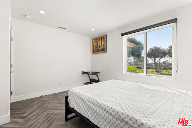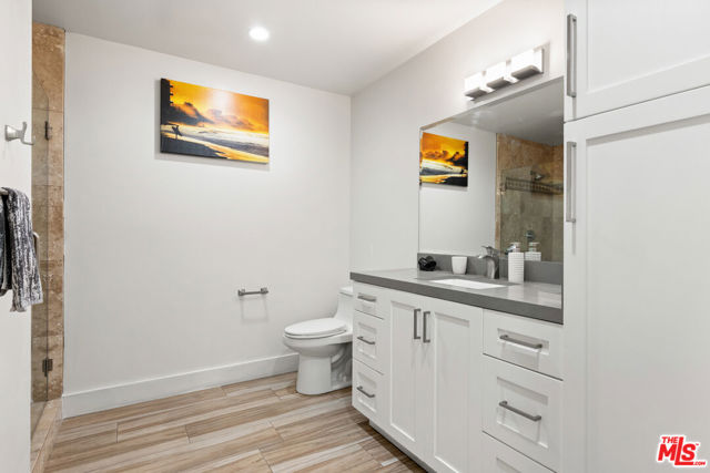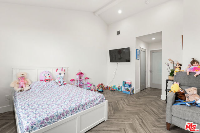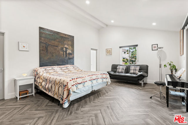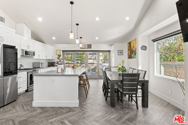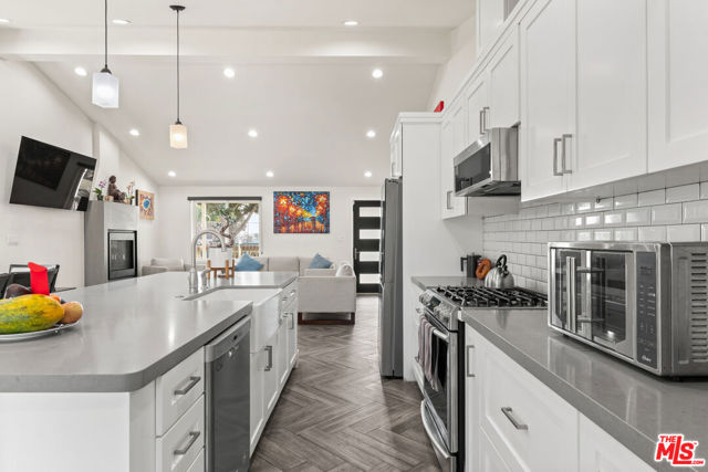 A feel good ranch style home in the Marlow Burns tract of Westchester, simply and wonderfully expanded and renovated in 2019, offers exceptional curb appeal and an open floor plan on a greenbelt street. A charming porch entrance with a custom front door greets you as you step inside and are welcomed by vaulted ceilings and a perfect amount of natural light infusing the open floor plan. The kitchen boasts a large center island with seating, quartz countertops, subway tile backsplash, stainless steel appliances, and soft-close shaker cabinets, with a large pantry, and a fireplace anchoring the living area. Step out onto the large covered deck for dining and lounging. The en suite primary bedroom features vaulted ceilings, a walk-in closet, and large sliding doors that open up to the rear deck. The left wing of the home features three bedrooms, one en suite and two with generous sizing, including a large second bedroom with a walk-in closet that will make you think you've walked into the primary bedroom. The home features well appointed finishes throughout, including 7' doors and sliders, fiberglass double pane windows, copper plumbing, a tankless water heater, and recessed lighting with dimmers. Additional features include central AC and heat, and a finished attached garage with laminate flooring, storage cabinets, serving as a versatile space perfect for a playroom, workshop, meditation, or training area. The hallway to the garage is flanked by a coat closet and laundry closet with side by side appliances and additional shelving. The backyard also features bonuses in the form of a storage shed, fruit trees and extra room for an herb garden.