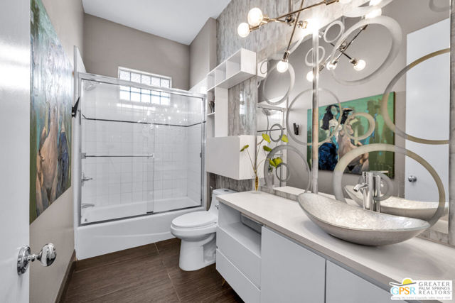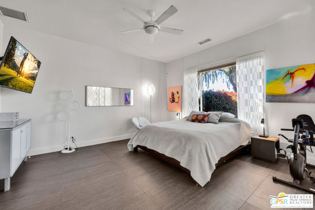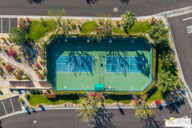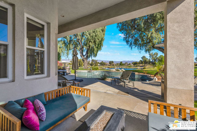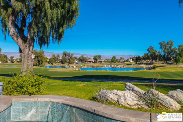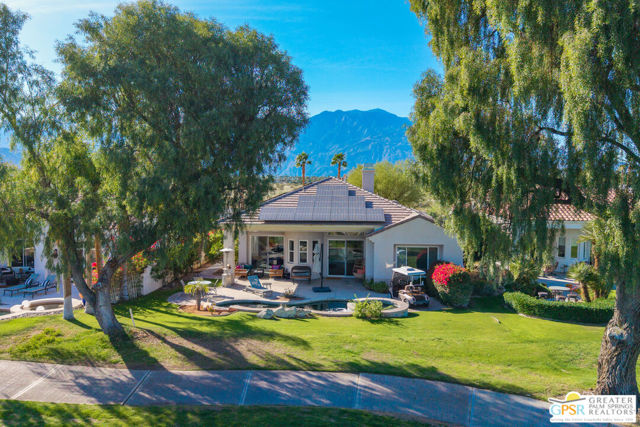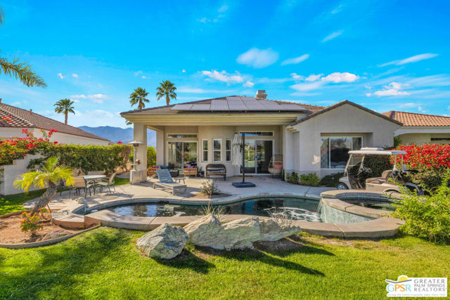 A true backyard oasis situated directly on the golf course, with expansive fairway and mountain views. Enjoy relaxed desert living with a private pool and spa, creating the perfect outdoor retreat. Inside, high ceilings enhance the open floor plan, offering a light and airy feel throughout. The dining area flows seamlessly into a chef's kitchen featuring granite countertops, a center island, breakfast bar, dinning area, and ample cabinetry. The home is equipped with a water softener system and instant hot water throughout, while a leased solar system (Power Purchase Agreement) with 48 panels generates enough power to cover the current homeowner's electrical needs. The primary suite offers direct patio access and a spa-like bath with walk-in glass-enclosed shower, soaking tub, dual vanities, and two walk-in closets. Guest bedrooms are thoughtfully separated from the primary suite. This home is part of a beautifully maintained, guard-gated community with additional roving security and low HOA dues. HOA benefits include cable TV, lighted tennis and pickleball courts, and a community pool/spa.