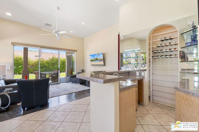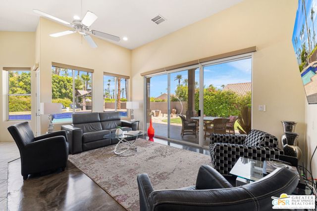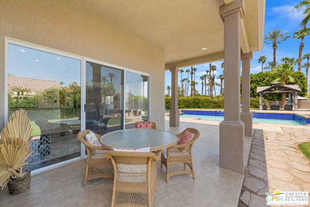 Wide-open mountain views, generous living spaces, and a prime cul-de-sac location define this Tamarisk-area retreat offered at an exceptional value. Set on more than one-third of an acre and just minutes from Tamarisk Country Club, this 3 bedroom, 4 bath home delivers space, privacy, and opportunity for buyers ready to make it their own. Double doors open to an impressive foyer that flows into formal living and dining areas with a fireplace, all beneath tall ceilings that create an airy, open feel. The layout offers both formal and casual living spaces, including a family room with wet bar and wine storage that looks directly onto the pool - ideal for entertaining or relaxed desert living. The kitchen is centered by a generous island with abundant storage and an adjacent breakfast area, with outdoor dining just steps away. The expansive backyard is the true standout, offering panoramic mountain views, a wraparound covered patio, and a resort-style pool finished in blue tile with cascading waterfalls and an attached spa. An elevated deck captures the scenery, while a putting green, outdoor shower, gazebo, and large lawn complete the private, walled setting. All three bedrooms are ensuite, each with its own private bath, providing excellent separation and flexibility. The primary retreat is substantial in scale, featuring double-door entry, sliders to the backyard, a corner fireplace, a large walk-in closet, dual vanities, soaking tub, and tiled shower. Guest suites enjoy patio access and privacy. Additional highlights include a three-car garage and owned solar panels, adding long-term efficiency and value. With strong bones, expansive views, and a compelling price, this home presents an opportunity to personalize a well-located property into a standout desert retreat. A big-view property with space, privacy, and upside perfectly positioned for a buyer ready to create something special.