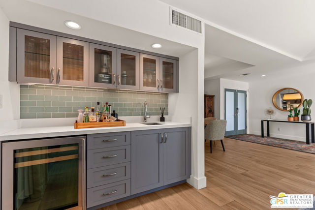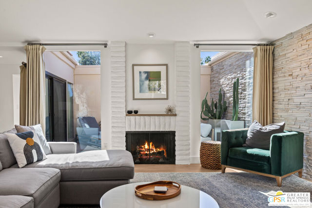 Welcome to a beautifully designed home in an exceptional community. From the moment you enter, there's an immediate sense of calm and ease that comes from thoughtful design and cohesive, high-end material choices. Tile floors run throughout the home, connecting seamlessly with floor-to-ceiling glass and extending out to the patio overlooking the quiet, expansive grounds of Sunrise East. Natural stone accent walls flow from interior to exterior, adding warmth and a timeless yet modern character. Symmetrical south-facing windows frame the white oak mantle and gas fireplace, filling the space with natural light and balance. The kitchen is designed with both function and quality in mind, featuring quartz countertops, frameless shaker cabinetry, and smart pull-out wood drawers, everything in its place. A matching wet bar in the living room makes entertaining effortless. The primary suite is a true retreat, offering blackout shades, white shutters, and a spa-inspired ensuite with wall-to-wall tile, an oversized shower, and a skylight that opens to let in fresh air. Sunrise East now offers four new pickleball courts and two tennis courts, and there's even more to discover in person, including the two-car garage. And yes, this is FEE land.