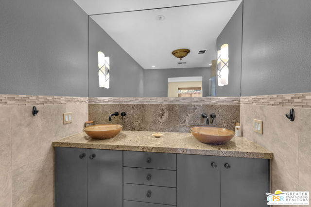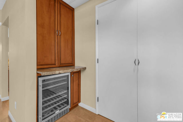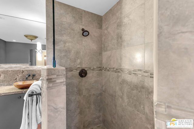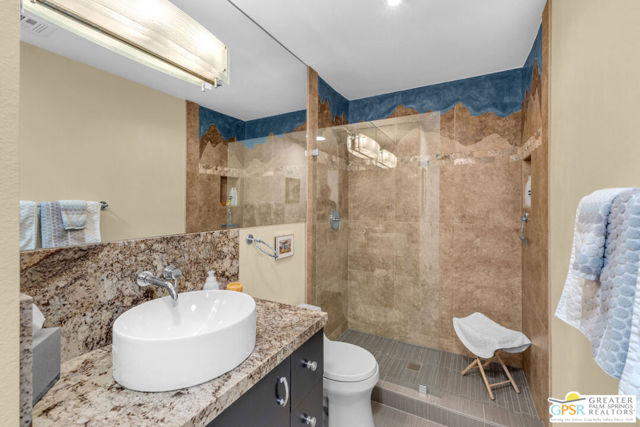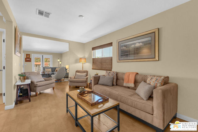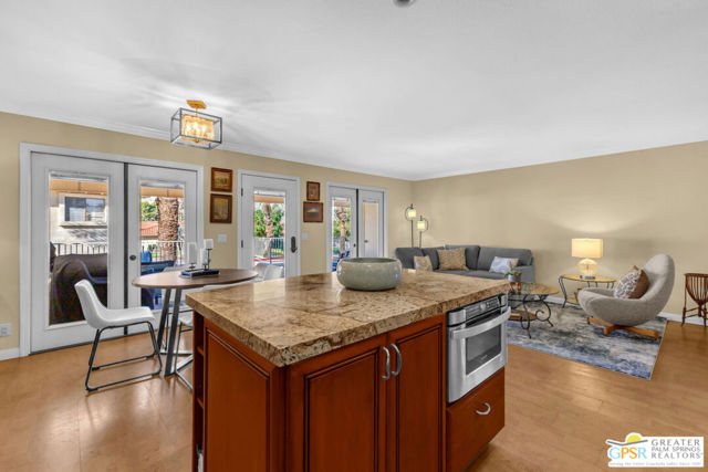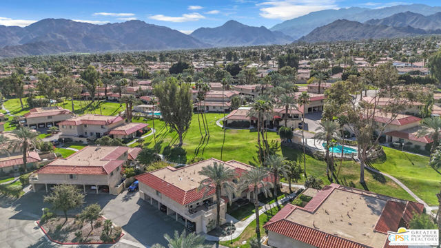 Exceptionally remodeled with a level of investment and craftsmanship rarely seen in condominiums. This 2-bedroom, 2-bath residence offers sweeping mountain and valley views and a thoughtfully reimagined floor plan that feels both elevated and inviting. The expansive great room seamlessly connects the kitchen, dining, and living areas, creating an ideal space. The kitchen features custom wood cabinetry, granite countertops, European appliances, a cleverly concealed appliance garage, and a movable island designed to adapt to the space when entertaining. Natural light is enhanced by a solar tube, while distinctive cork flooring throughout adds warmth, comfort, and easy maintenance. An adjacent flex space functions beautifully as a TV lounge or home office and includes a wine refrigerator and expanded granite prep area. The primary suite is a standout, offering extensive built-in storage and a spa-inspired bathroom with dual glass bowl sinks, a wall-hung vanity, a generous walk-in shower, and a striking freestanding soaking tub. The guest bath features a walk-in shower with custom tile detail inspired by the surrounding mountain landscape. French doors open to a sunny west-facing patio with retractable awning, perfect for enjoying afternoon light, desert sunsets, and mountain views. The community delivers an exceptional lifestyle with tennis and pickleball courts, multiple pools and spas, fitness facilities, bocce, practice greens, and a recently updated clubhouse that serves as the social heart of the neighborhood. A rare opportunity to own a truly elevated residence offering design, views, and lifestyle at a compelling value. Make your appt to come see this gem today!