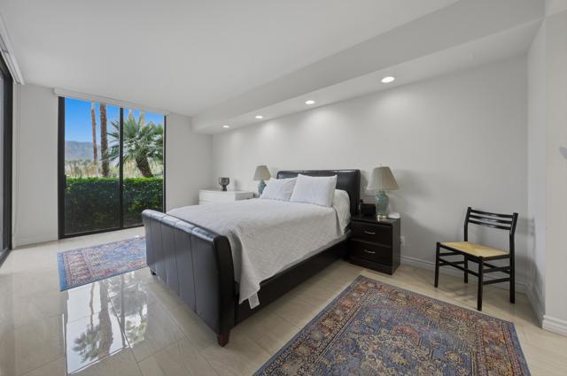 This spacious popular dual primary-bedroom suite floor plan has been completely renovated for both style and functionality. Throughout the home every room enjoys spectacular mountain views through 9-foot windows leading out to a covered terrace, ideal for relaxing. The formal entry and living room feature striking stacked stone walls and cozy gas fireplace is outfitted with dynamically backlit-70-inch LG TV. You will appreciate the many upgrades including porcelain tile flooring throughout, gorgeous kitchen featuring a convenient breakfast bar, contemporary custom cabinetry with abundant storage, beautiful quartz counters deliver a sleek modern aesthetic, built-in stainless-steel appliances, and custom lighting. The HVAC system is 6-months new and features a smart Nest thermostat. Additional upgrades include Kasa switches, compatible with both Alexa+ and Google, which allow for easy voice-operated control of lighting and other smart devices. Desert Island stands as a distinctive high-rise condominium community on a lush, 25-acre private island encircled by a sparkling lake and a lush green 18-hole championship golf course. Residents enjoy beautifully landscaped park-like grounds with walking paths, fruit trees, seating areas, tennis and pickleball courts, heated swimming pools and spas, pedal boats, fishing facilities, and secure 24-hour guard-gated entry. The HOA fees cover on-site management, central air-conditioning, water, gas, trash, Spectrum cable TV, Wi-Fi Internet, and the maintenance of landscaping and common areas, providing a low-maintenance, carefree lifestyle. Conveniently located close to shopping, dining, theaters, galleries, and casinos, with easy access to Eisenhower Medical Center. Schedule your showing today and discover why this home is not just a property, but a place to create lasting memories!