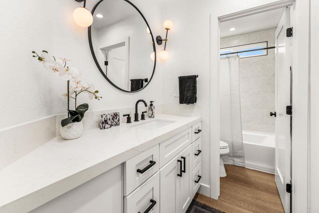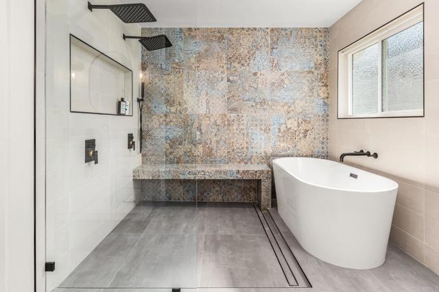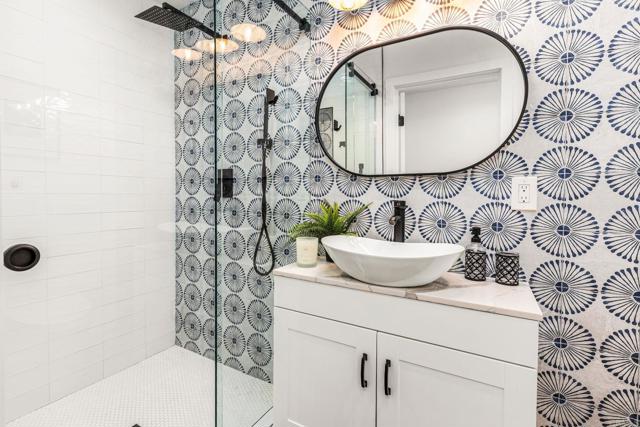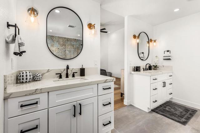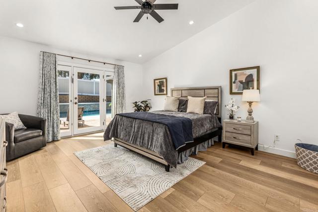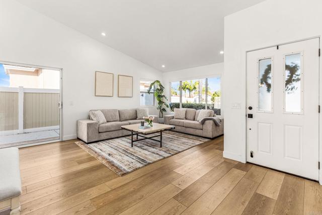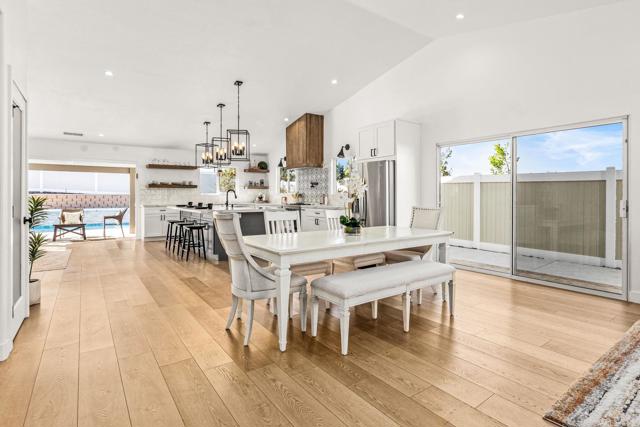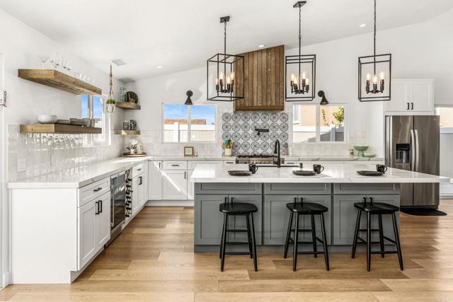 ASSUMABLE VA LOAN WITH A 3.625% INTEREST RATE! This stunning, fully remodeled single-story home in Oceanside offers 4 bedrooms, 3 bathrooms, and a 2-car garage, tucked away on a quiet cul-de-sac. Designer finishes and premium upgrades shine throughout, while the open floor plan and soaring ceilings create a bright, airy atmosphere. An additional flexible living space provides the perfect option for a dining area, lounge-style seating, or an elegant bar area with a fireplace, ideal for entertaining or relaxing. Multi-panel bi-fold patio doors seamlessly connect indoor and outdoor living, opening to a private backyard oasis with a resort-style pool, spa, covered outdoor BBQ with bar seating, solar, and a variety of mature fruit trees, including avocado, lemon, lime, plum, orange, and apple, along with fresh ginger root, creating a beautiful and productive garden setting. The gourmet BBQ bar seating features a large island, custom cabinetry, top-of-the-line appliances, and a wine refrigerator. The spacious owner's suite offers a luxurious bathroom with a soaking tub and direct access to the resort-style backyard. This exceptional home truly shows like a model—inside and out. Ideally situated between Orange County and San Diego, this home offers the perfect balance of tranquility and convenience with easy access to I-5 and Highways 78 & 76, and is just minutes from Camp Pendleton, local beaches, scenic trails, dining, and shopping.