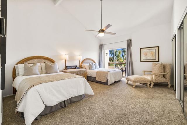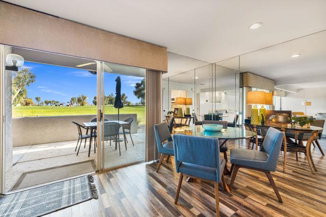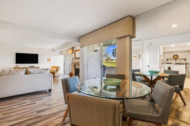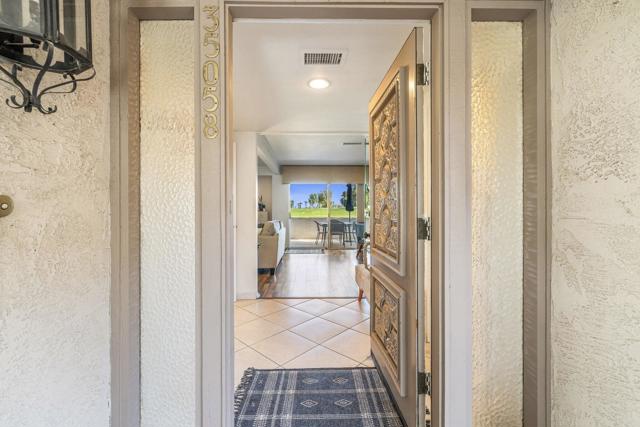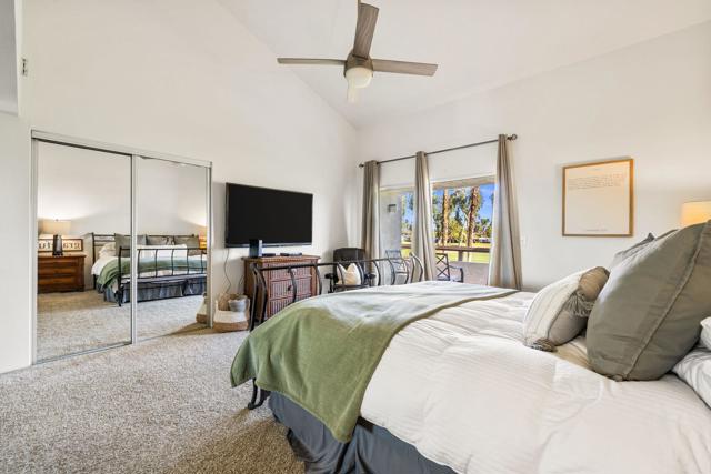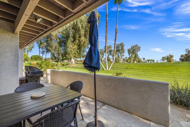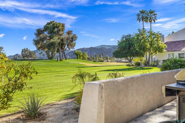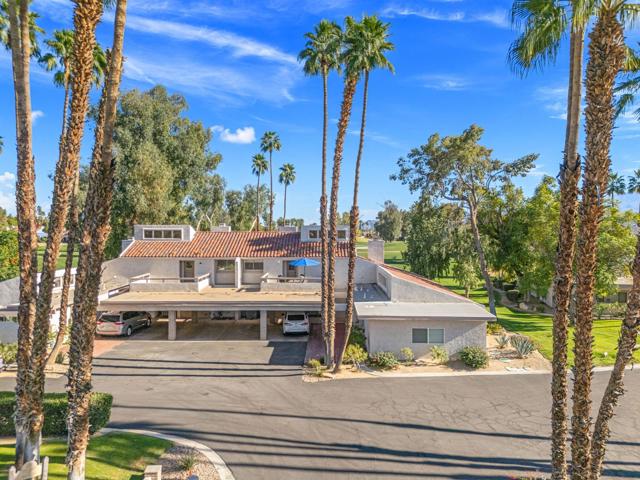 Set within the gates of Mission Hills Country Club, this TURNKEY FURNISHED Villas 3 residence enjoys sweeping views of the 17th hole on the Dinah Shore Tournament Course. The main living level features generous, light-filled living and dining spaces designed for both everyday comfort and effortless entertaining. A fireplace and bar elevate the space, while sliders extend the living area outdoors to two separate patios overlooking the fairway. The home has been thoughtfully updated with a newer air-conditioning system, water heater, and remodeled upstairs bathroom. Near the entry, the galley kitchen offers ample storage and includes a washer and dryer for added convenience. The upper level hosts two well-sized bedrooms, each opening to its own balcony with expansive golf course views and beautiful morning light. An additional west-facing deck provides a private retreat to enjoy mountain sunsets and desert evenings. Quietly positioned away from traffic, the property offers covered parking just steps from the front door along with secure, private storage. Purchasing a Social Membership offers privileges such as, access to Mission Hills' fitness center, tennis and pickleball courts, croquet lawns, and the recently enhanced clubhouse with multiple dining options. Optional golf memberships are available for those wishing to enjoy the legendary courses associated with the Bob Hope Classic and Dinah Shore LPGA events. Ideally located near Palm Springs International Airport, El Paseo, gaming, dining, and entertainment, this home is well suited as a primary residence, seasonal escape, or investment property. Land lease extended through 2121!
